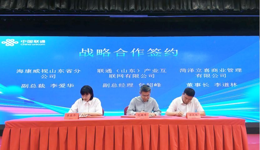 会议期间,联通(山东)产业互联网有限公司与海康威视山东省分公司、菏泽立喜商业管理有限公司签署战略合作协议,将围绕视频物联网、AI监测、智慧门店等场景深化合作,共同打造行业领先的数字化解决方案。