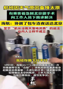 2025年9月9日,海南航空一航班因北京暴雨天气备降太原机场。机上一名乘客因第二天需要在北京进行手术,情绪激动之下向工作人员下跪,恳求尽快安排前往北京。这一场景被其他乘客拍摄并上传网络,迅速引发广泛关注。海航后续为36名急客协调了包车送往北京,并安排了退票和住宿服务。据齐鲁蛙眼舆情大数据平台显示,自9月9日至9月17日,相关话题全网信息量约7500余条。