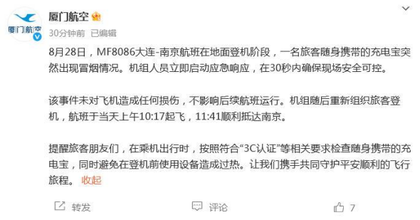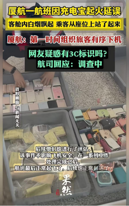 厦门航空一航班因充电宝起火延误