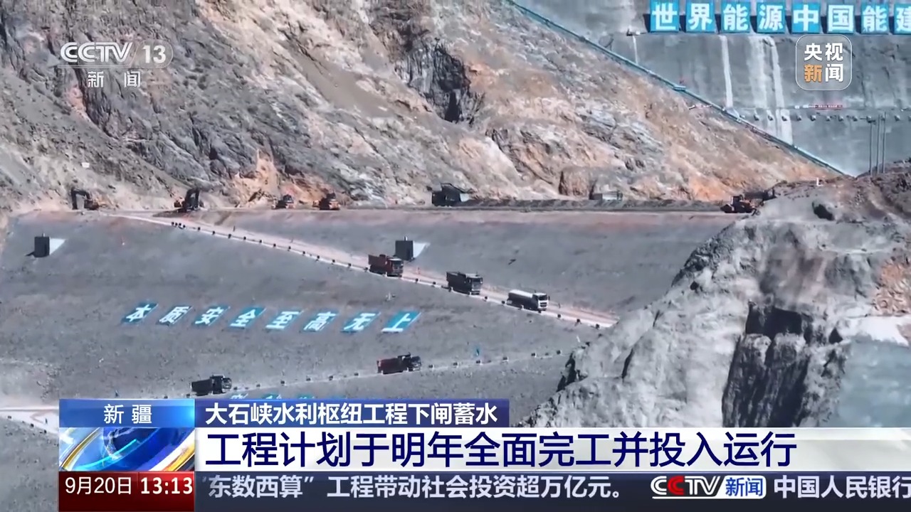 总台央视记者 张伟:我现在所在的位置是新疆阿克苏地区,大石峡水利枢纽工程现场,随着工作人员按下水闸按钮,重达200吨的巨型水闸缓缓落下,历时近六年的大石峡水利枢纽工程正式进入首台机组投产发电前的冲刺阶段。