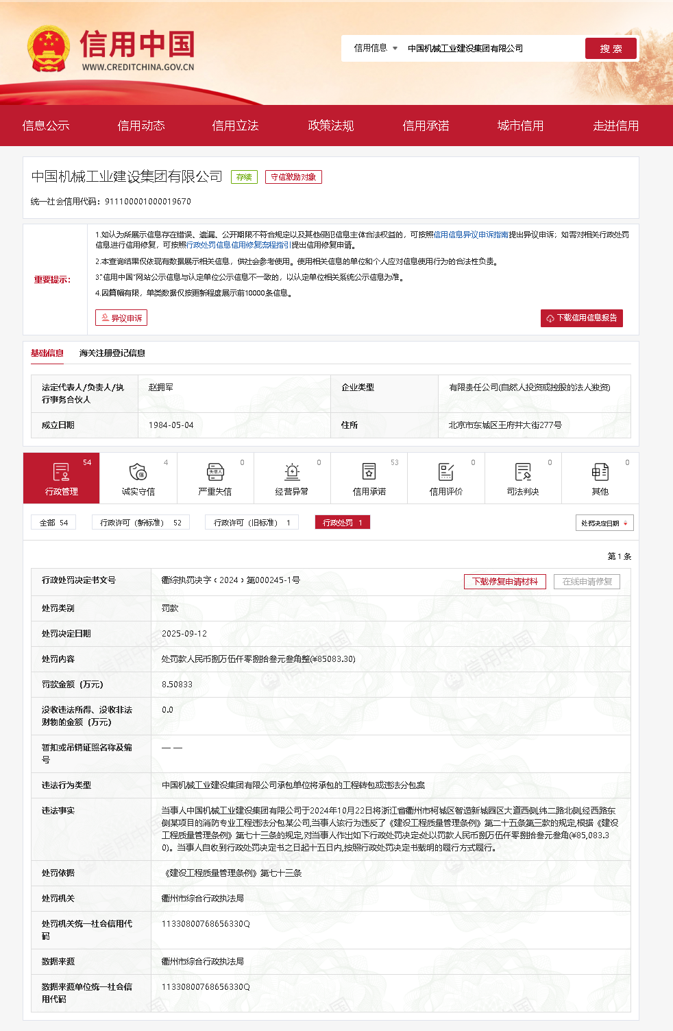 近日,齐鲁晚报·齐鲁壹点记者从信用中国获悉,中国机械工业建设集团有限公司因承包单位将承包的工程转包或违法分包案,被衢州市综合行政执法局罚款8.5万余元。