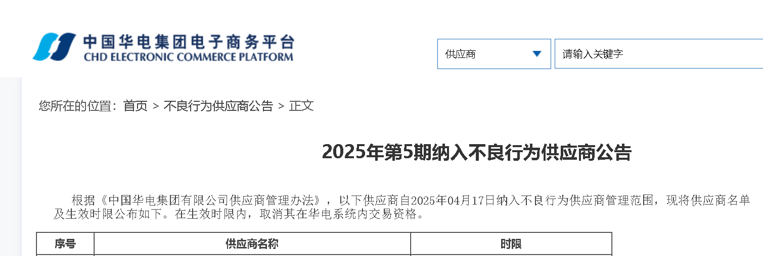 此外,齐鲁晚报·齐鲁壹点记者从中国华电集团电子商务平台不良行为供应商公告中看到,中国机械工业建设集团有限公司于2025年4月17日被纳入不良行为供应商,在生效期限内,取消其在华电系统内交易资格。