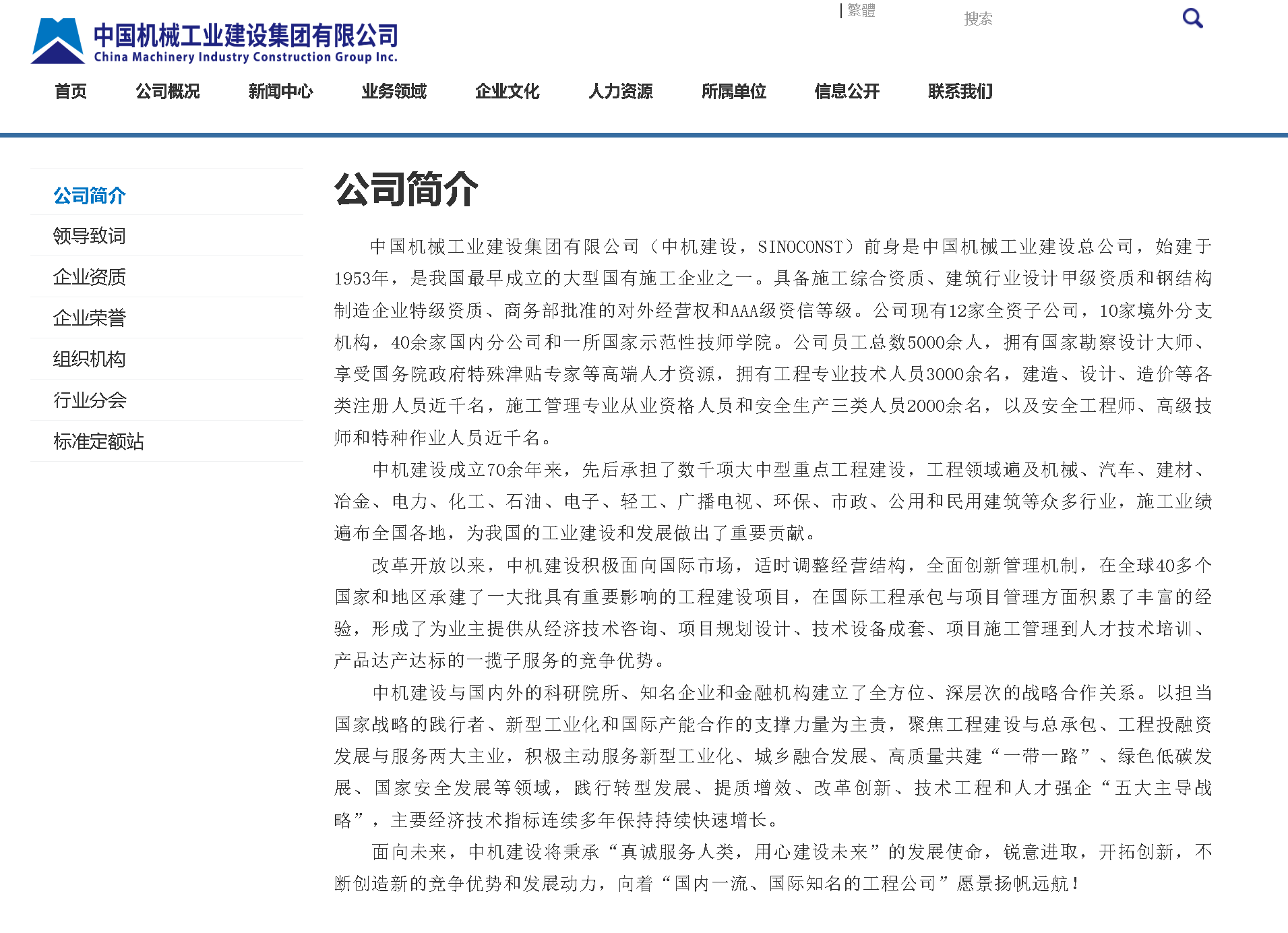 该公司官网显示,中国机械工业建设集团有限公司(中机建设,SINOCONST)前身是中国机械工业建设总公司,始建于1953年,是我国最早成立的大型国有施工企业之一。