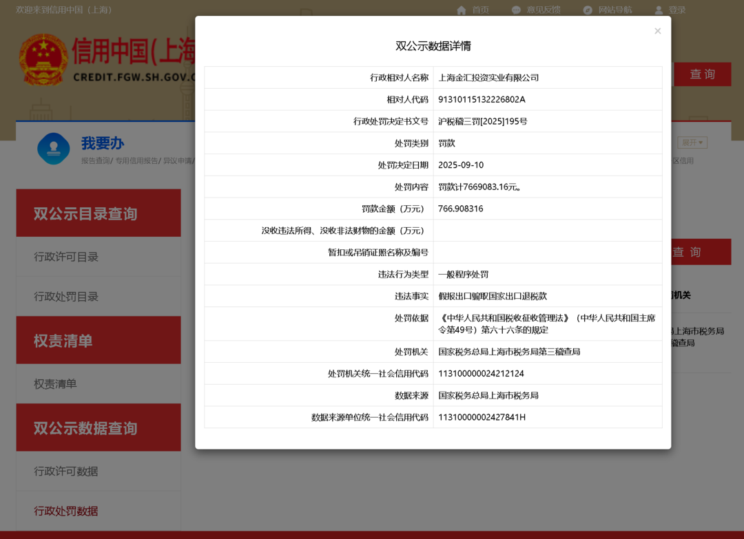近日,齐鲁晚报·齐鲁壹点记者从信用中国(上海)获悉,上海金汇投资实业有限公司因假报出口骗取国家出口退税款,被国家税务总局上海市税务局第三稽查局罚款766.9万余元。