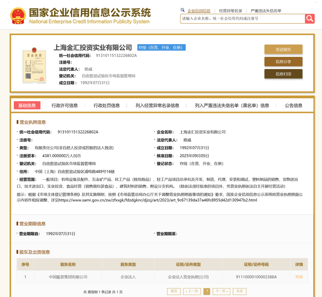 公开信息显示,上海金汇投资实业有限公司成立于1992年7月31日,法定代表人路威,股东为中国服装集团有限公司。中国服装集团有限公司股东为中国恒天集团有限公司。以上公司均为中国机械工业集团有限公司旗下公司。