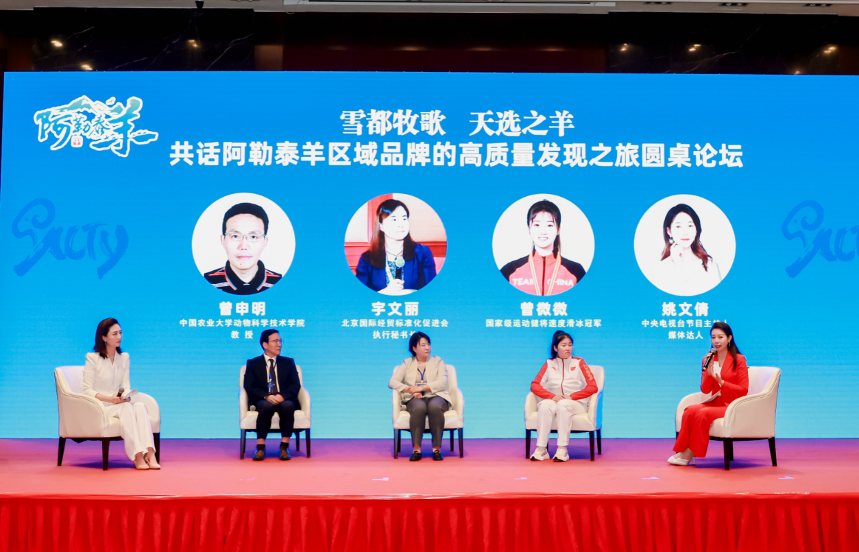 圆桌论坛环节,中国农业大学动物科学技术学院教授曾申明、北京国际经贸标准化促进会执行秘书长宇文丽、国家级运动健将速度滑冰冠军曾微微、中央电视台节目主持人姚文倩聚焦高质量发展路径,分别从品种育种、国际标准、健康体验和品牌传播的维度,为阿勒泰羊绘制品牌发展蓝图。