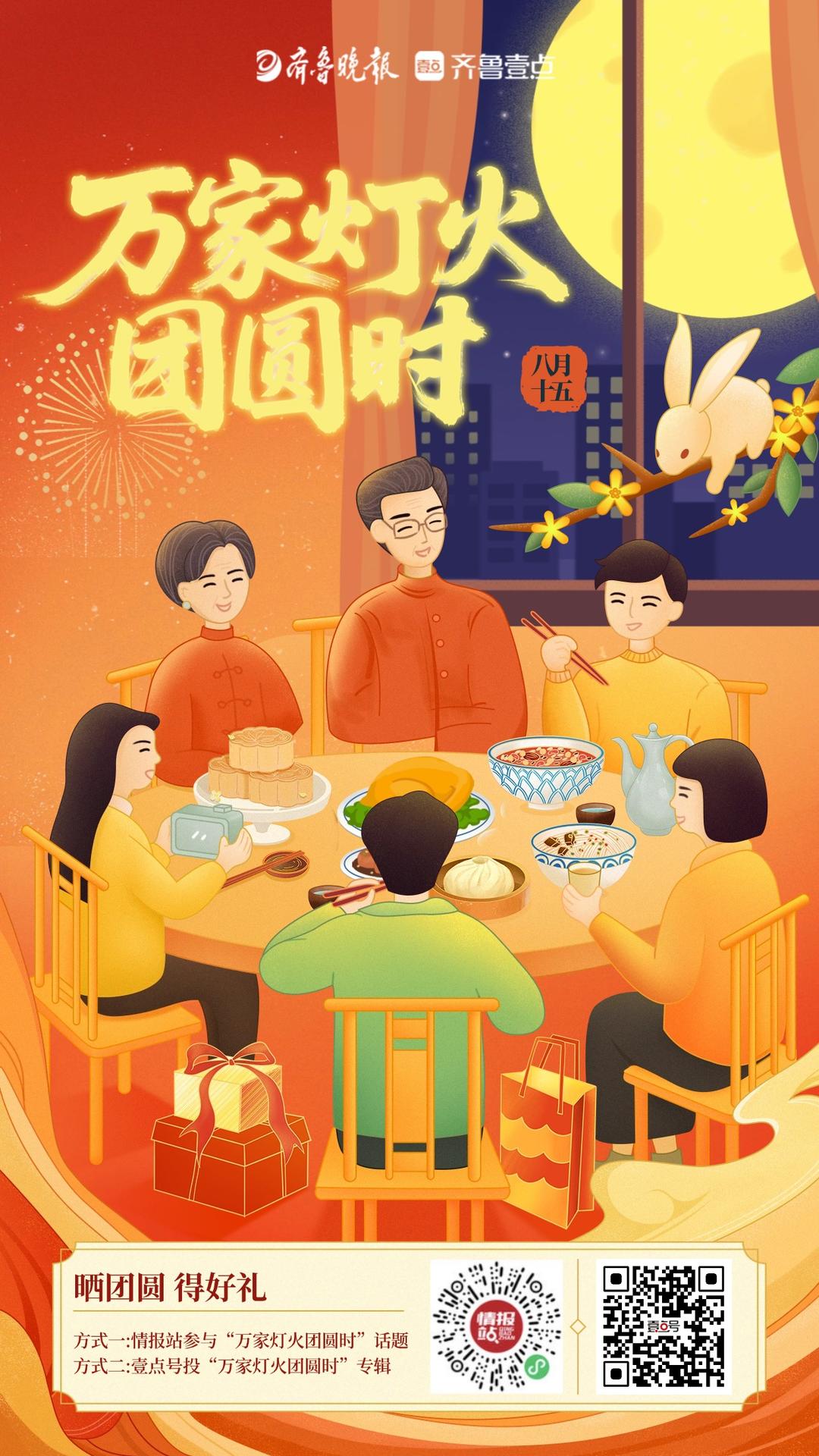 中秋,不仅是一个团圆的节日,更是一种文化的传承和情感的凝聚。让我们在忙碌的生活中停下脚步,回归家庭,感受亲情的温暖;让我们在喧嚣的世界里寻得一份宁静与祥和,领略传统文化的魅力。一年一度的中秋佳节即将到来,齐鲁晚报·齐鲁壹点开启2025中秋互动共创——万家灯火团圆时,诚邀您来参与互动分享中秋祝福,定格温馨动人的团圆瞬间,还有机会获得由齐鲁壹点特别定制的中秋团圆礼盒哦!