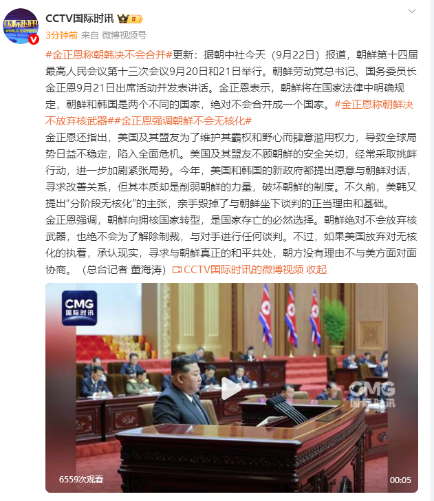 据朝中社今天(9月22日)报道,朝鲜第十四届最高人民会议第十三次会议9月20日和21日举行。朝鲜劳动党总书记、国务委员长金正恩9月21日出席活动并发表讲话。金正恩表示,朝鲜将在国家法律中明确规定,朝鲜和韩国是两个不同的国家,绝对不会合并成一个国家。