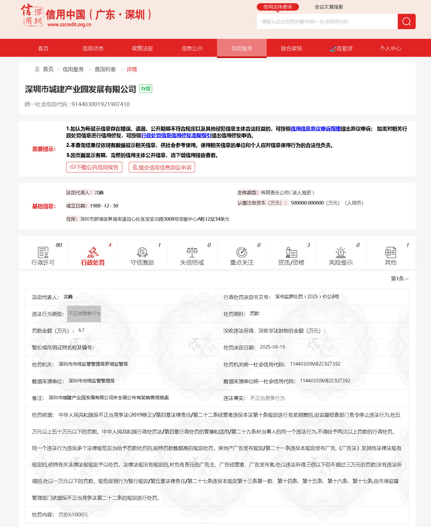 近日,齐鲁晚报·齐鲁壹点记者从信用中国(广东深圳)获悉,深圳市城建产业园发展有限公司因不正当竞争行为,被深圳市市场监督管理局罗湖监管局罚款6.1万元。备注为深圳市城建产业园发展有限公司未全面公布有奖销售信息案。