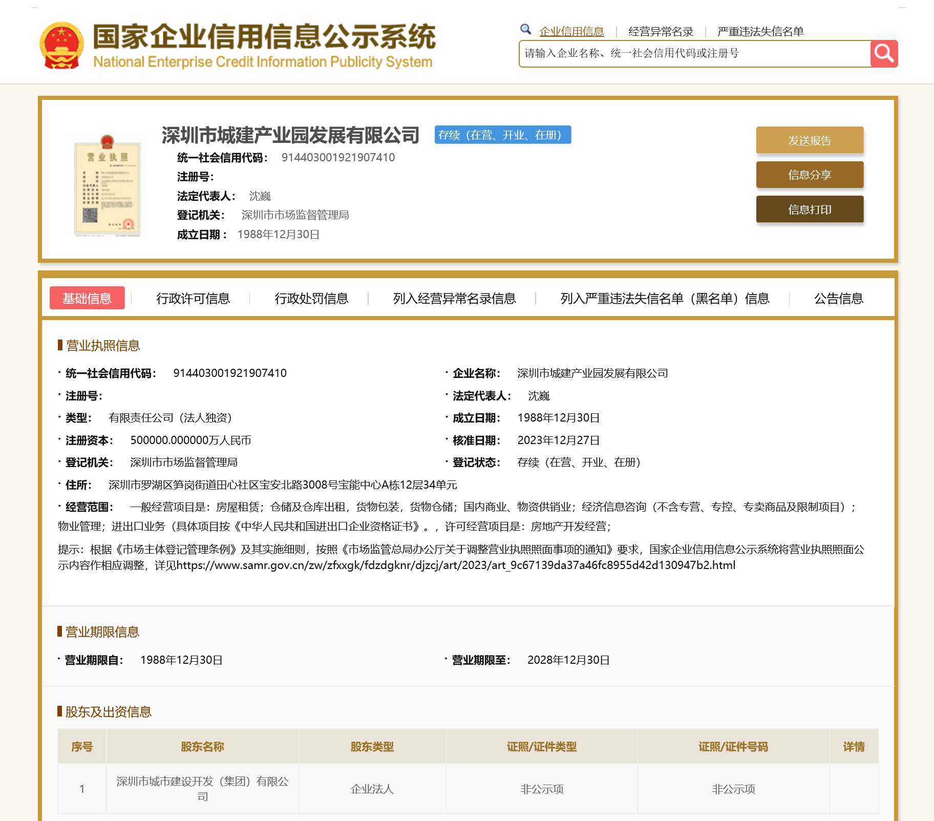 公开信息显示,深圳市城建产业园发展有限公司成立于1988年12月30日,法定代表人沈巍,股东为深圳市城市建设开发(集团)有限公司。