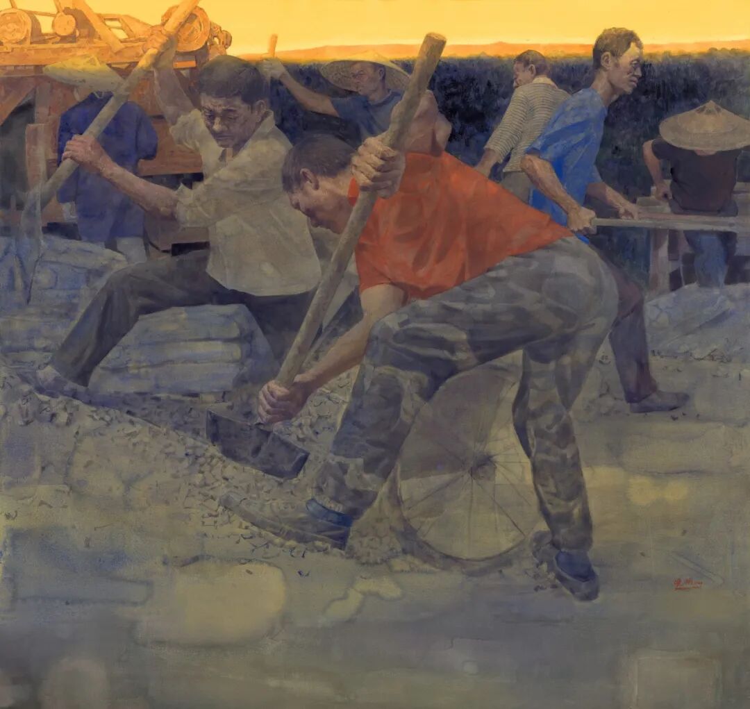 城市经济的繁荣发展,吸引了务工者的目光和大量的涌入,他们绝大部分来自农村,以积极的姿态参与到城市的建设中来。作品《冰天雪地》《最美建设者》描绘的是初代务工人群参与城市基础建设,为城市的发展、繁荣起到了不可磨灭的重要作用。《城市梦》这一组画更贴近新时代,表现的是新一代年轻打工者的形象,为了实现心中的梦想,他们拖家带口、迈向繁荣的城市。科技革命、网络经济成为“新质生产力”的代表,发达的高速公路、世界瞩目的中国高铁,如同大动脉流向城市,同时也开为打工者开辟了新的职业赛道——中国快递。作品《时代新景——都市蜜蜂》中穿着黄色或蓝色的工作服、骑着两轮或三轮电动车的快递大军如同辛勤的“蜜蜂”般聚集然后再流向不同的街区,他们像毛血管一样蔓延在城市的各个角落,构成了新时代城市景观又一道靓丽的风景线。