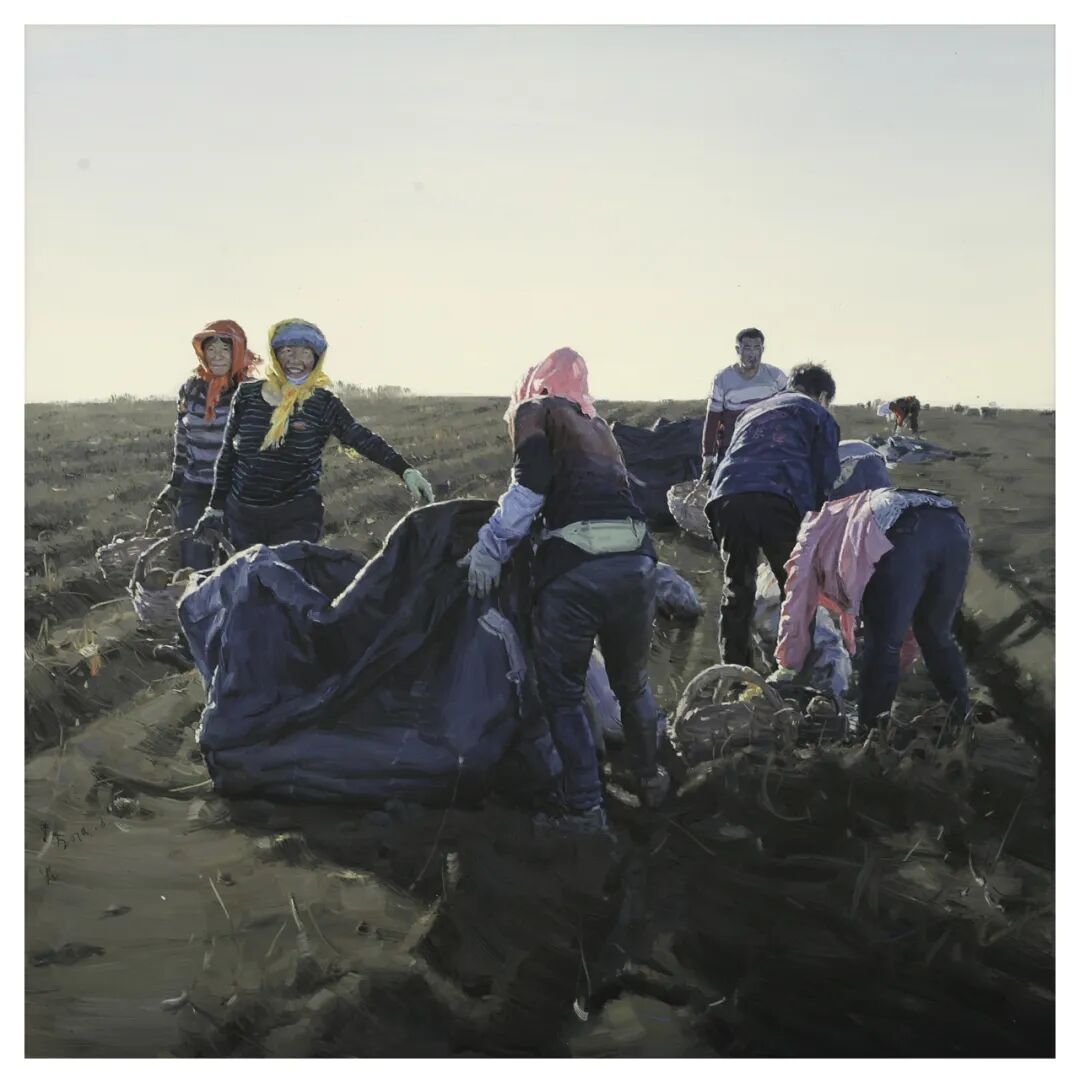 中外艺术史中不乏以农村劳动者为主题的经典之作。南宋马远《踏歌图》表现的就是“丰年人乐业、陇上踏歌行”的快乐之景,元四家之一的王蒙创作有《谷口春耕图》,明代浙派大家戴进绘有《春耕图》,现代绘画大家徐悲鸿在1961年也创作了《九州无事乐耕耘》,之后历届全国美展中均有以农村和农民叙事的优秀作品涌现。法国批判现实主义画家米勒的《拾穗者》《晚钟》等,后印象派大家梵高的《吃土豆的人》《麦田的乌鸦》,都以描绘农村和农民题材而广为人知。本次展览中《黑土地——收货的季节》《朝阳》《坝上十个月》《大山的节日》《美丽乡建进行时》等都是农村叙事题材的优秀之作。《黑土地——收货的季节》以长卷的形式表现了收获小麦的场景,金黄色的基调、忙碌的人群彰显了丰收的喜悦;《朝阳》描绘的是秋后收获红薯的现实场景,画家并没有对劳动者进行细致入微的刻画,反而将描绘的重点放在劳动的过程中,是对劳动者群体的礼赞;《大山的节日》以经典的“金字塔”构图,对节日的欢快场景进行了纪念碑性的讴歌;《美丽乡建进行时》则是对新时代艺术乡建的呼应,表达了农村人民在物质生活满足的同时对精神生活的不断追求,反映了新时代农村崭新的风貌。