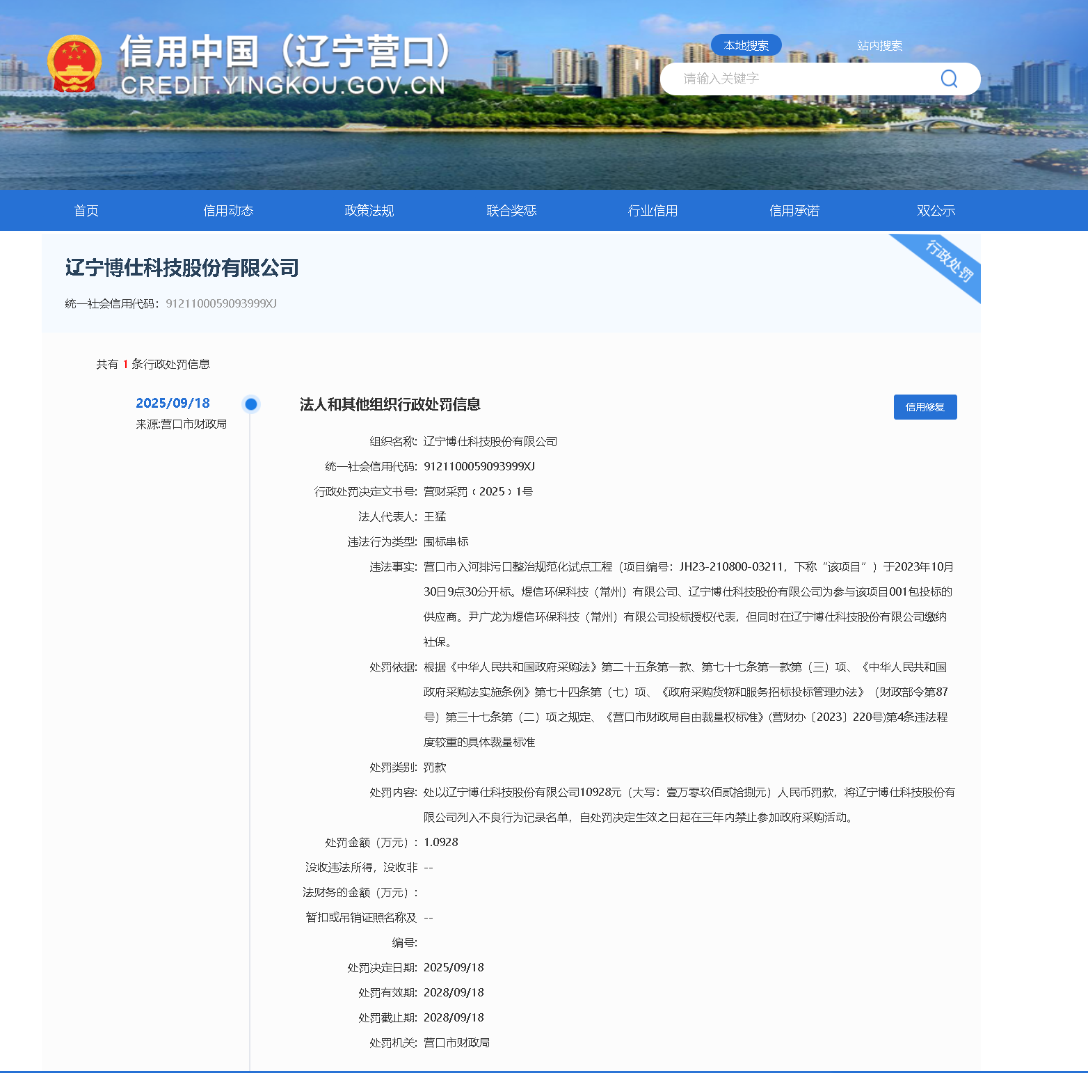 近日,齐鲁晚报·齐鲁壹点记者从信用中国(辽宁营口)获悉,辽宁博仕科技股份有限公司(下称“辽宁博仕科技”)因围标串标,被营口市财政局罚款10928元,将辽宁博仕科技列入不良行为记录名单,自处罚决定生效之日起在三年内禁止参加政府采购活动。