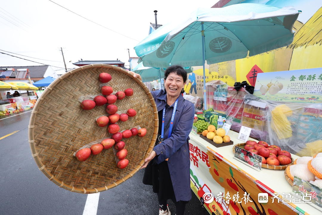 主会场旁还设置了电商平台区,来自全国各地的新农人和主播热情推介家乡特产,欢快的歌声与笑语交织,庆丰收氛围浓厚。招远阜山镇种植户兰美霞用苹果摆成了个“丰”字庆祝丰收节,她说:“今年又是丰收年,欢迎大家来村里旅游,吃红富士苹果。”