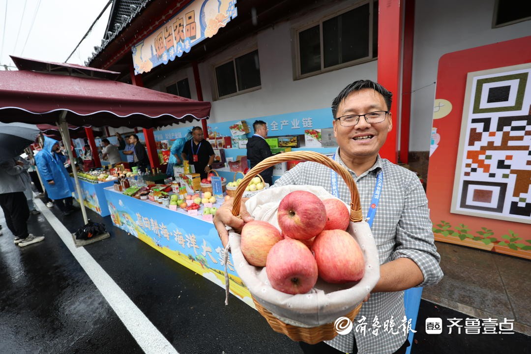 丰收节为各地特色农产品提供了展示平台。在烟台农产品展台前,栖霞市唐家泊镇肖家夼村党支部书记王鹏绩向游客推介栖霞苹果,“来尝一尝这个苹果,脆甜爽口。”