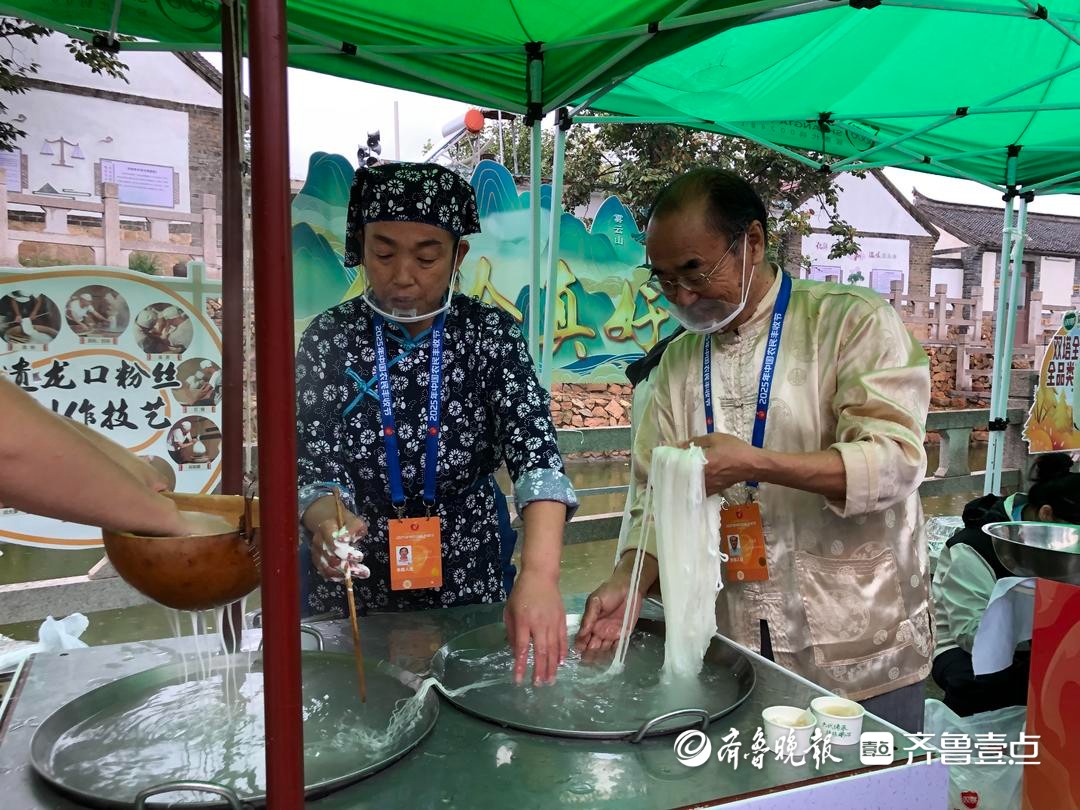 在非遗展区,国家级非物质文化遗产龙口粉丝传统制作技艺代表性传承人郭兰堂现场展示手工制作,游客品尝粉丝后赞不绝口:“手工制作的口感,和平时买的不一样。”