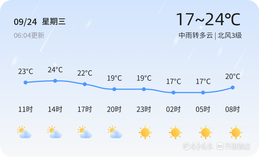 今天是9月24日,星期三,农历八月初三。日照市今日天气为中雨转多云,气温在17℃至24℃之间,北风3级,空气湿度较高,达到93%。目前,全市各区天气基本一致,均为中雨转多云,市民出行请注意携带雨具,注意交通安全。