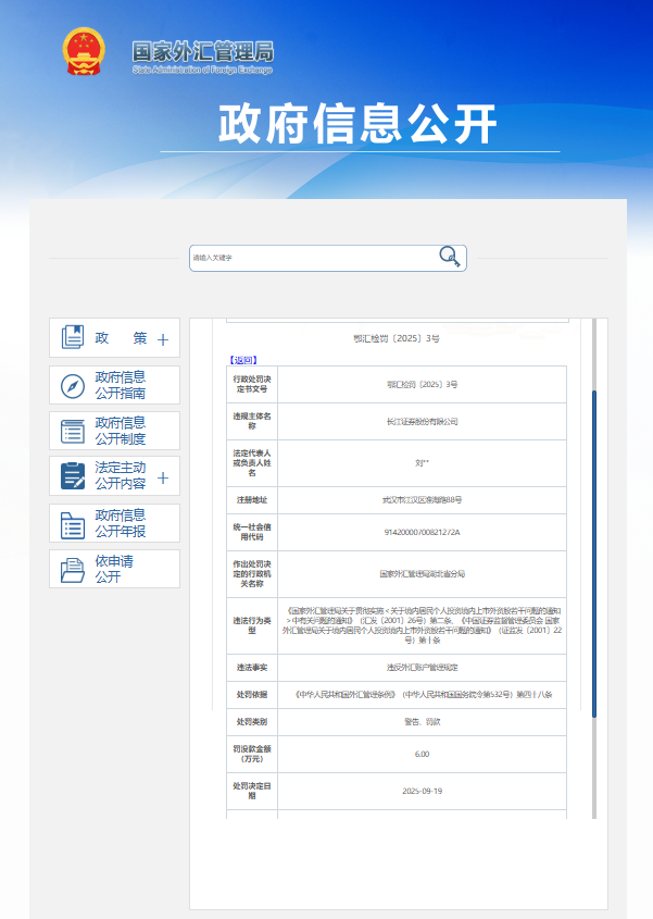 近日,齐鲁晚报·齐鲁壹点记者从国家外汇管理局政府信息公开行政处罚信息一栏获悉,长江证券股份有限公司因违反外汇账户管理规定,被国家外汇管理局湖北省分局警告、罚款6万元。