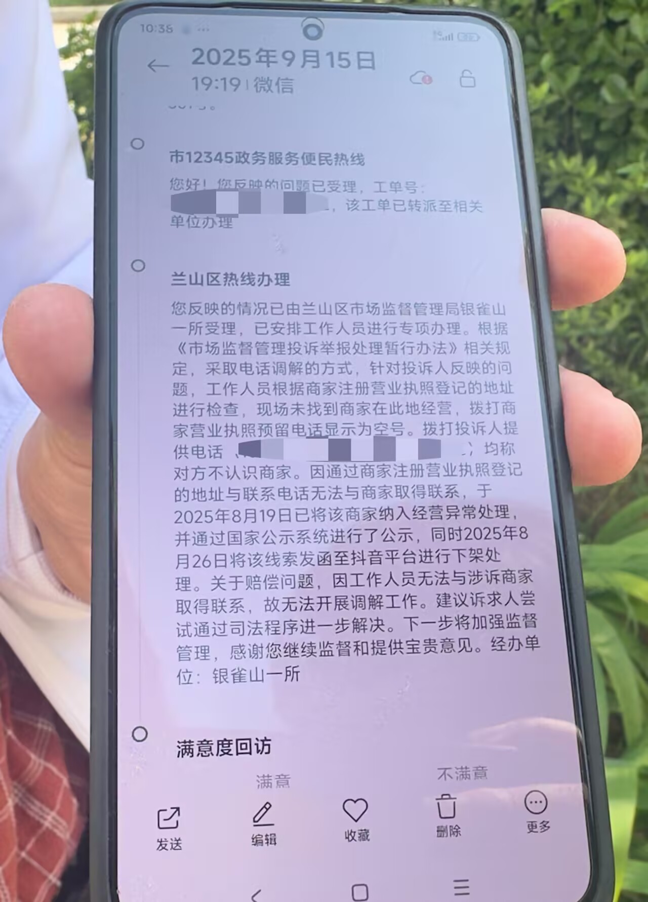 临沂市兰山区市场监督管理局银雀山一所受理后就此事给了陈女士回应。回应称,工作人员根据商家注册营业执照登记的地址进行检查,现场未找到商家在此地经营,拨打商家营业执照预留电话显示为空号。因通过商家注册营业执照登记的地址与联系电话无法与商家取得联系,已于2025年8月19日将该商家纳入经营异常处理,并通过国家公示系统进行了公示,同时2025年8月26日将该线索发函至该平台进行下架处理。关于赔偿问题,因工作人员无法与涉诉商家取得联系,故无法开展调解工作。