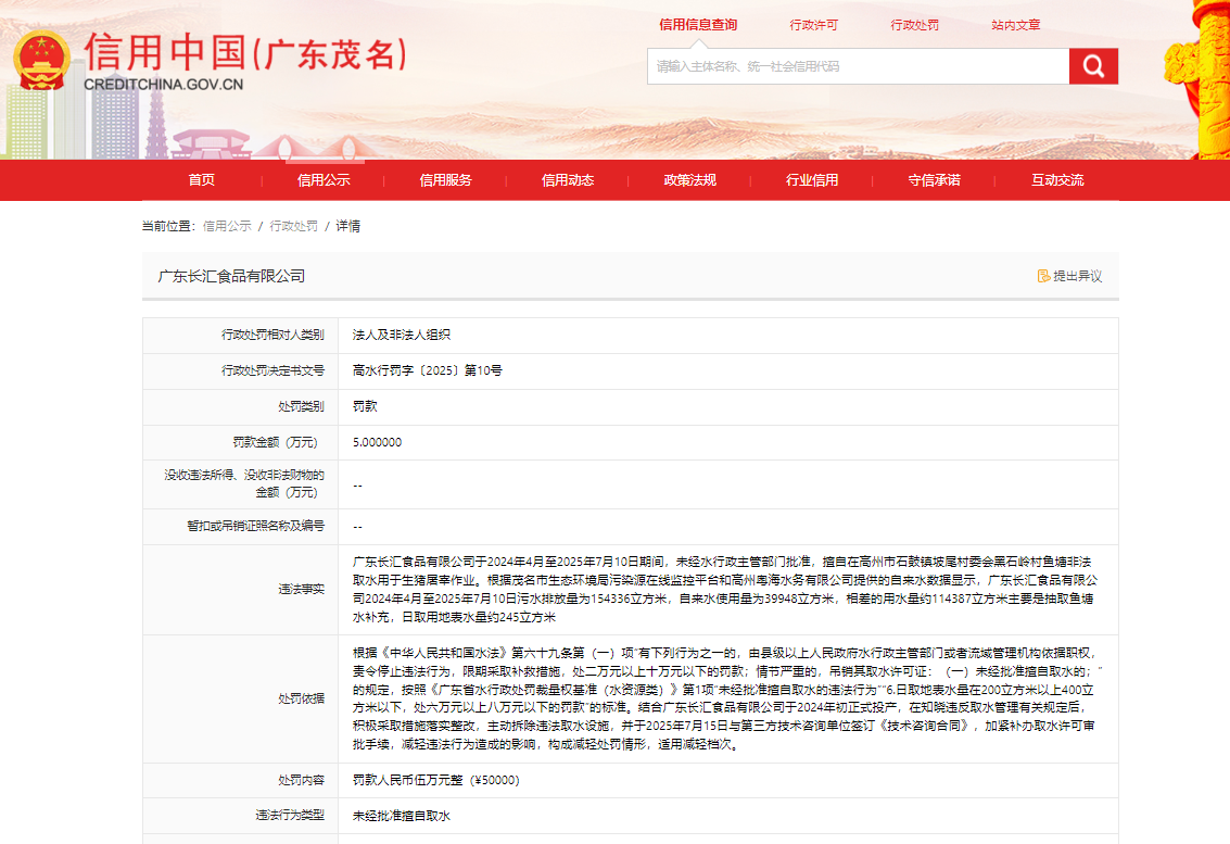 处罚公告显示,广东长汇食品有限公司在2024年4月至2025年7月10日期间,未经水行政主管部门批准,擅自在高州市石鼓镇坡尾村委会黑石岭村鱼塘非法取水用于生猪屠宰作业。