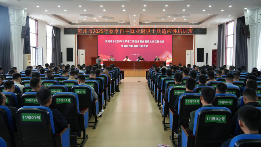 9月24日上午,滨州市2025年秋季第二期自主就业退役士兵欢迎仪式暨适应性培训班在秦台军事训练中心举办。市退役军人事务局党组书记、局长史红芳参加仪式,市退役军人事务局党组成员、副局长柴新勇主持仪式并作动员讲话,市军创企业家协会会长张建军分享创业经验、传递榜样力量,参加今年9.3阅兵的自主就业退役士兵代表以亲身经历讲述了“从受阅方阵到社会岗位”的角色转变。来自博兴、邹平、惠民、无棣4个县市的200余名秋季返乡自主就业退役士兵参加开班仪式和集中培训。