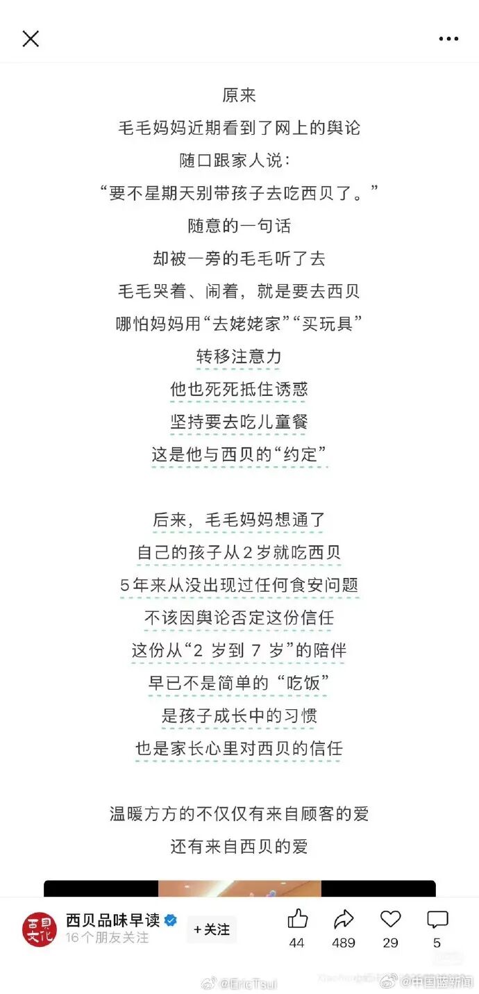 西贝删除《7岁的毛毛:我以为我再也吃不到西贝了》温情公关文,网友:让人哭笑不得