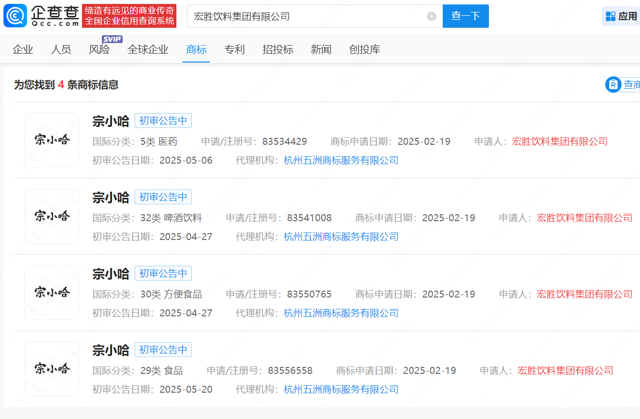 企查查APP显示,今年2月以来,宗馥莉任董事的宏胜饮料集团有限公司申请注册多枚“娃小宗”、“娃小哈”、“宗小哈”商标,国际分类涉及啤酒饮料、方便食品、材料加工等。目前“娃小哈”商标状态在注册申请中,“娃小宗”、“宗小哈”商标处于初审公告状态。