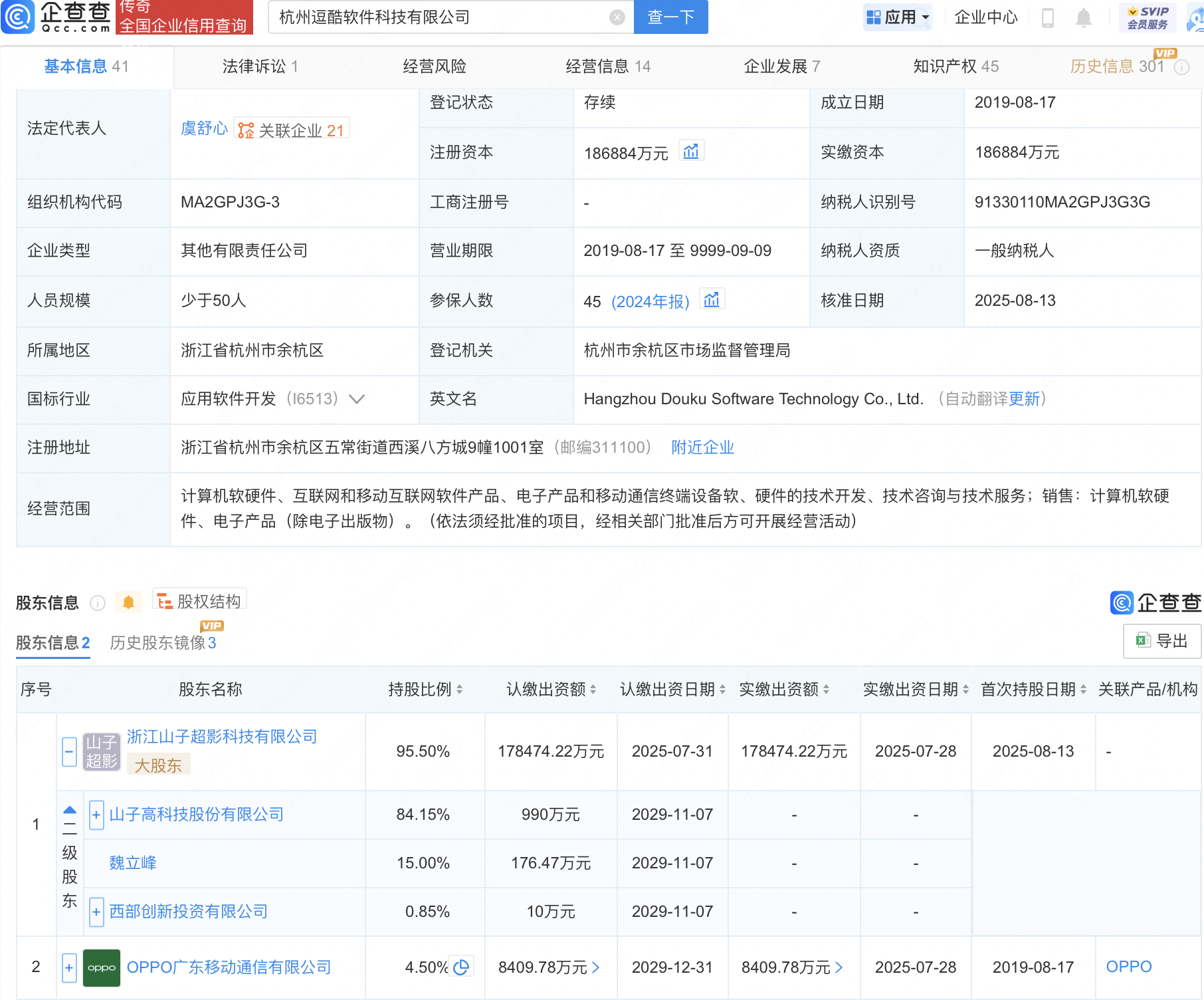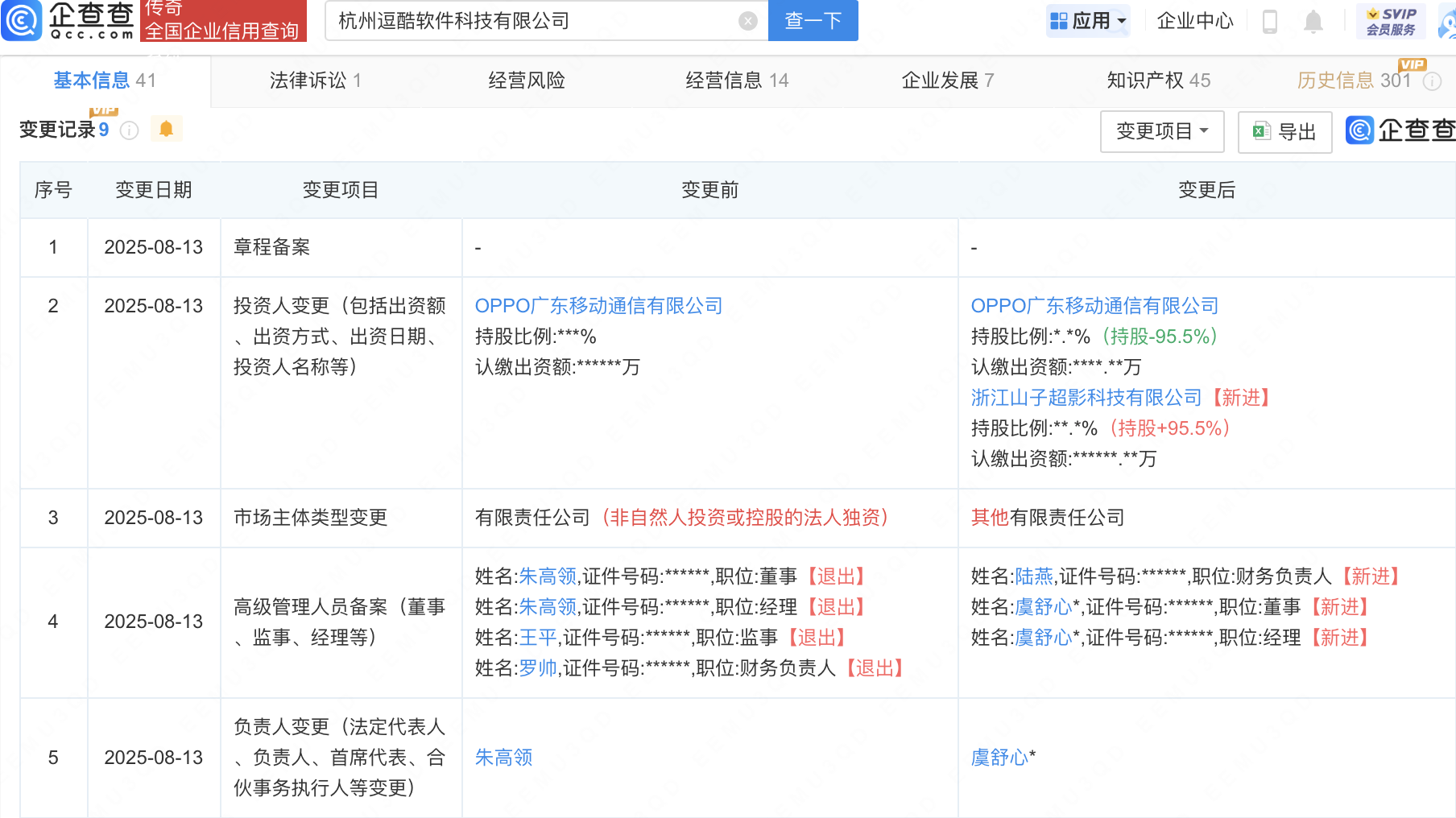 企查查APP显示,近日,负责OPPO项目的杭州逗酷软件科技有限公司发生工商变更,新增山子高科旗下浙江山子超影科技有限公司为股东,持股95.5%,同时OPPO广东移动通信有限公司对该公司持股比例由100%降至4.5%。企查查信息显示,该公司成立于2019年,注册资本约18.69亿元,经营范围包含:计算机软硬件、互联网和移动互联网软件产品、电子产品和移动通信终端设备软、硬件的技术开发、技术咨询与技术服务等。