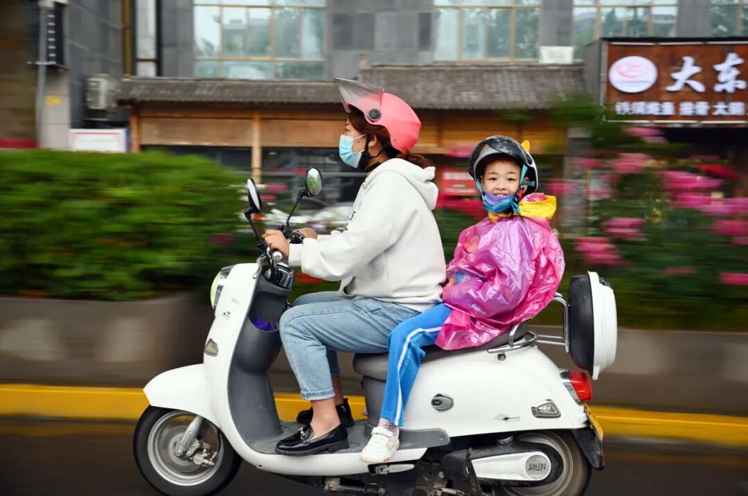 放学后,家长骑着电动自行车带孩子回家 (图源:新华社)