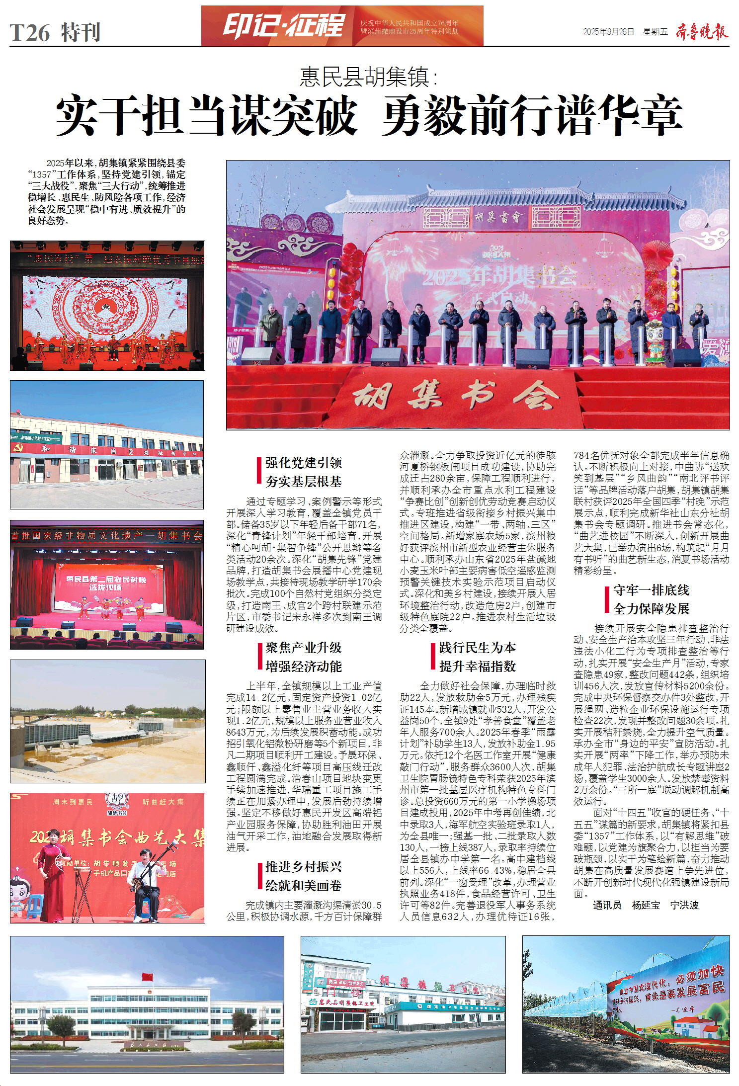 2025年以来,惠民县胡集镇紧紧围绕县委“1357”工作体系,坚持党建引领,锚定“三大战役”,聚焦“三大行动”,统筹推进稳增长、惠民生、防风险各项工作,经济社会发展呈现“稳中有进、质效提升”的良好态势。