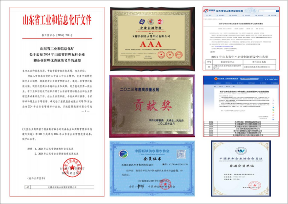 近年来,先后获评山东省管理标杆企业、“鲁安杯”全省职工冬季“三查三防”安全生产竞赛优秀组织单位、山东省中小企业创新研发中心、滨州市工业设计中心、集团及3家子公司入选山东省创新型中小企业;集团及2家子公司获评“AAA 级信用企业”;集团及1家子公司荣获山东省“专精特新”中小企业等荣誉称号。是中国水利企业协会、中国城镇供水排水协会、山东省城镇供水排水协会会员单位。标志着企业在管理、创新、安全、信用等领域的综合能力获得权威认可。