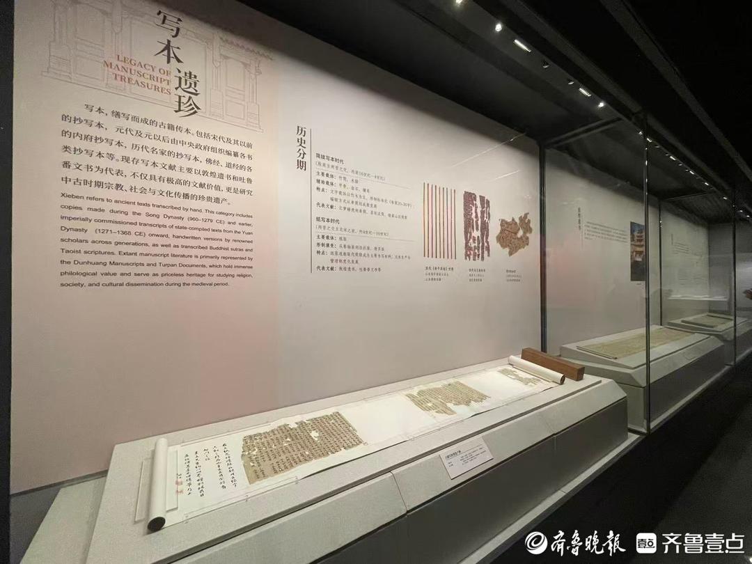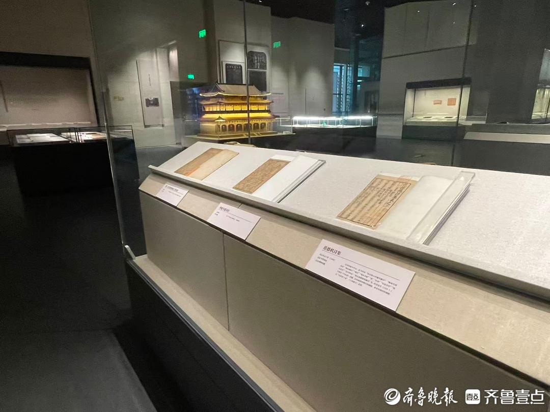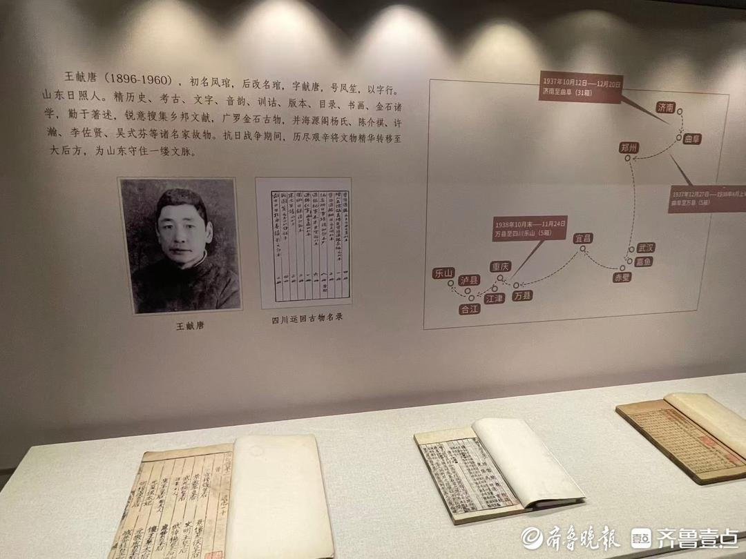 进入展厅,首先映入眼帘的便是“鲁壁”造型墙,其背后便是“鲁壁藏书”的故事。当年秦始皇焚书,孔子第九代孙孔鲋将《尚书》《礼记》等儒家典籍藏于孔子故宅的墙壁之中,这些典籍在秦火中幸存,直到汉代拆迁老宅时被偶然发现,成为早期儒家经典得以流传的关键。这堵“鲁壁”,不仅藏着书籍,更藏着孔子后代对其思想的坚守。不止于此,从展厅内,还能了解到山东省立图书馆(即山东省图书馆)时任馆长王献唐在抗日战争时期,将山东文物的精华护送至大后方保存,并在抗战胜利后“完璧归赵”的故事。