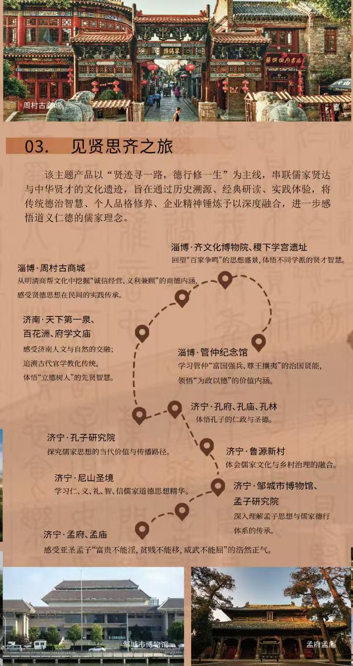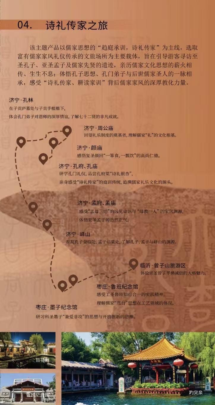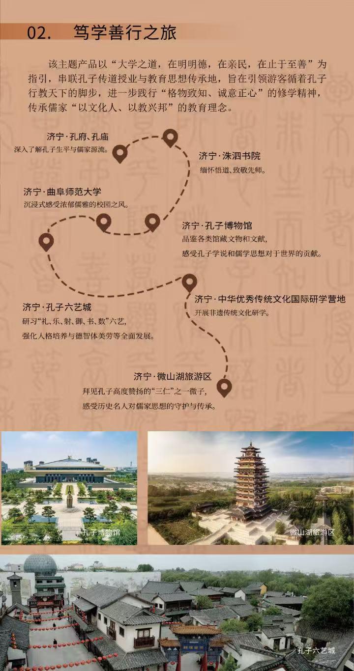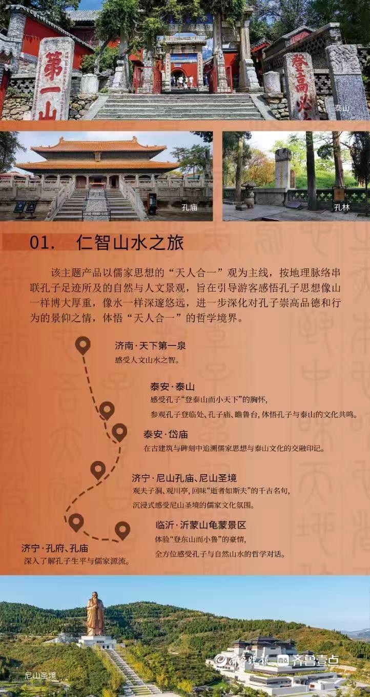此次活动以孔子在齐鲁大地的足迹和影响为脉络,以儒家思想的核心要义为灵魂,面向青少年、成年人、银发族、亲子家庭、国际游客等不同群体,发布仁智山水、笃学善行、见贤思齐、诗礼传家、德治润心、和美与共六条“跟着孔子研学游”主题研学产品。几大线路均可让研学的学生们感悟“知行合一”之道,如见贤思齐之旅,可领略“仁、义、礼、智、信”的儒家思想精髓;诗礼传家之旅,可感受“儒风润人,耕读家训”的家风教化力量;和美与共之旅,可增强“大道之行,天下为公”的世界大同愿景……