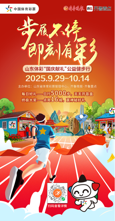 金秋送爽,丹桂飘香,为迎接国庆佳节,积极响应全民健身的号召,山东体彩将携手齐鲁晚报·齐鲁壹点,于9月29日正式启动“国庆献礼”公益健步行活动。本次活动以“步履不停,即刻有彩”为主题,邀请广大市民在云端迈开脚步,用行走感受健康,用步数点亮齐鲁,赢取每日惊喜和终极大奖。