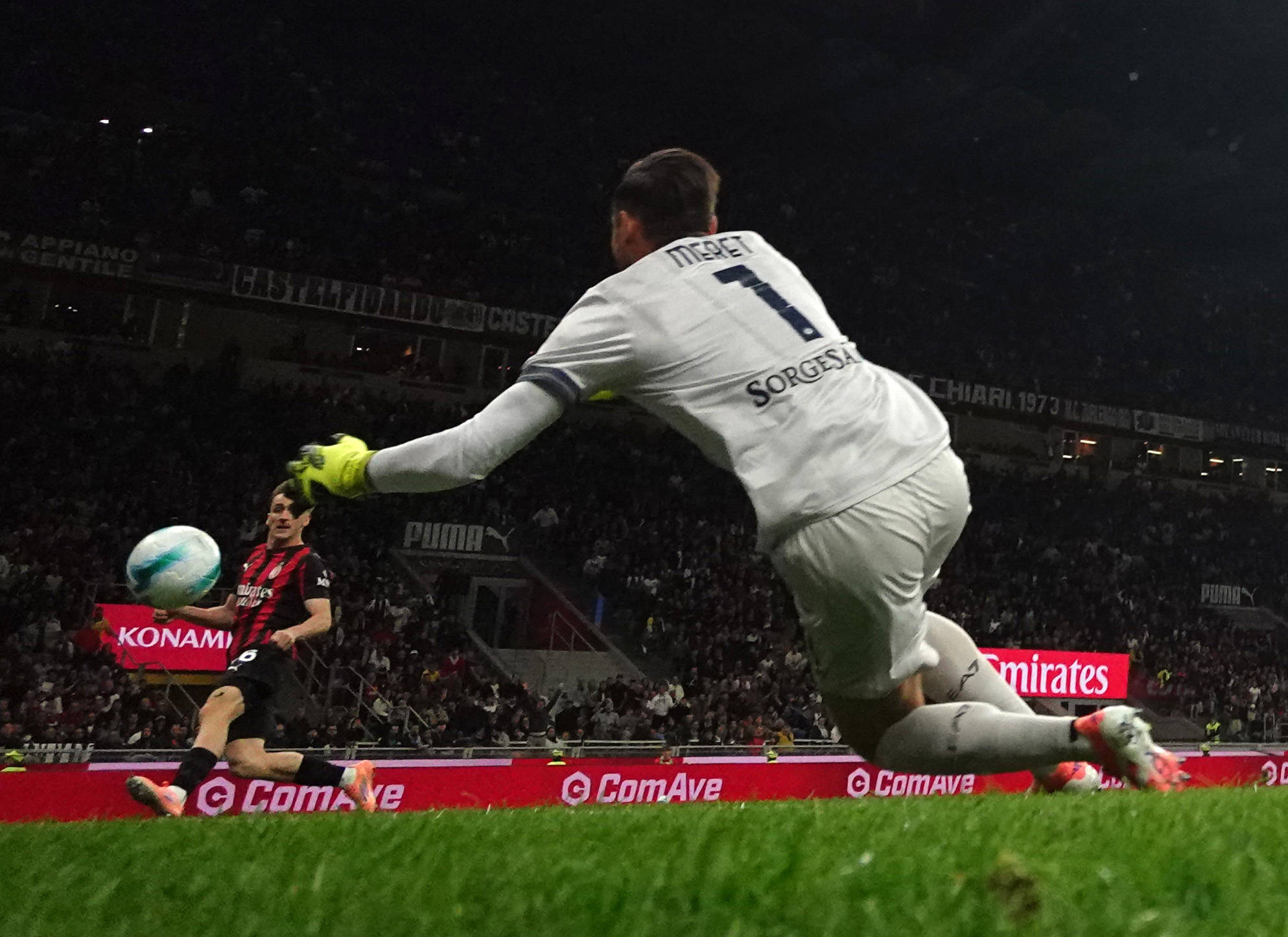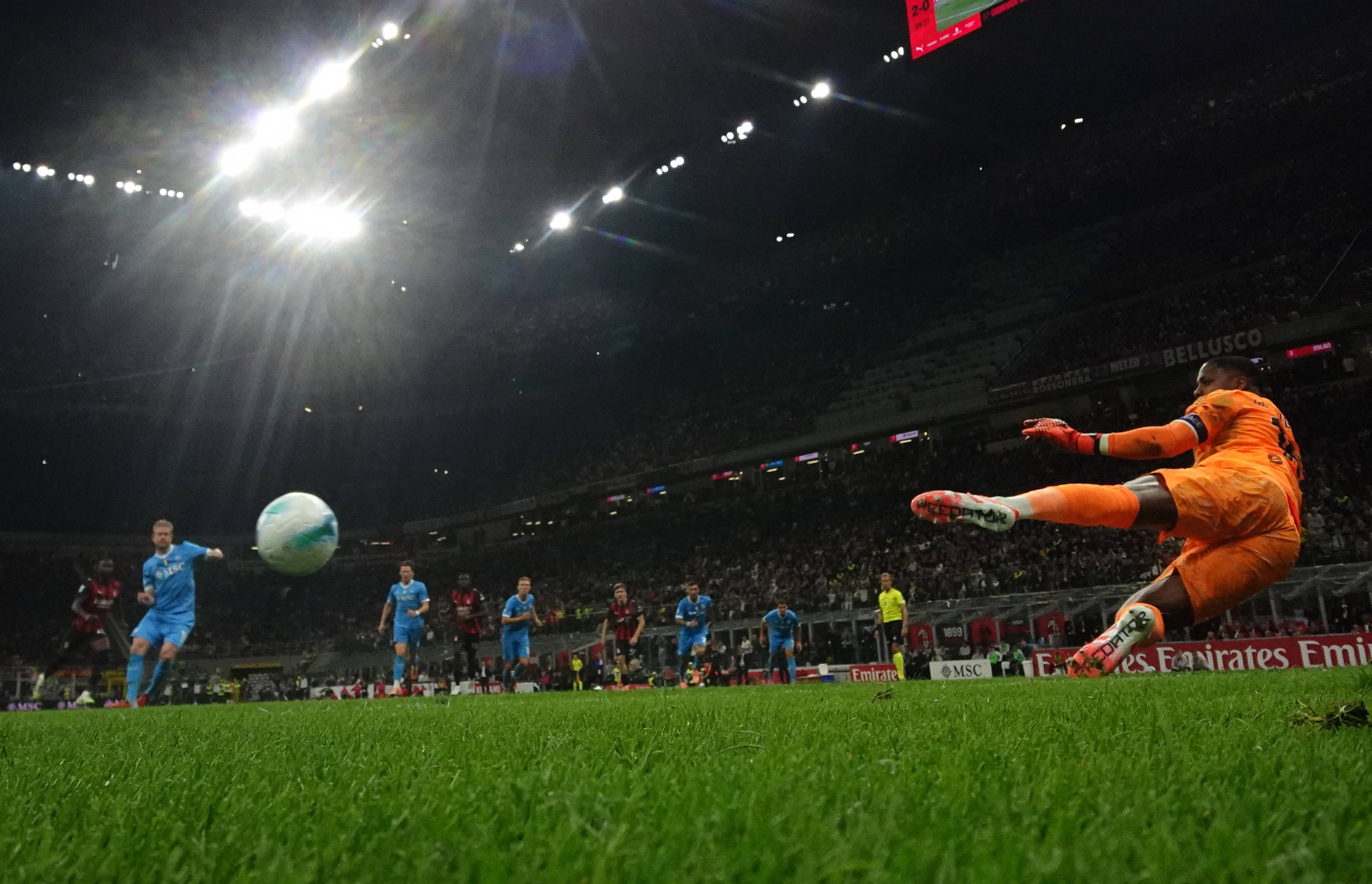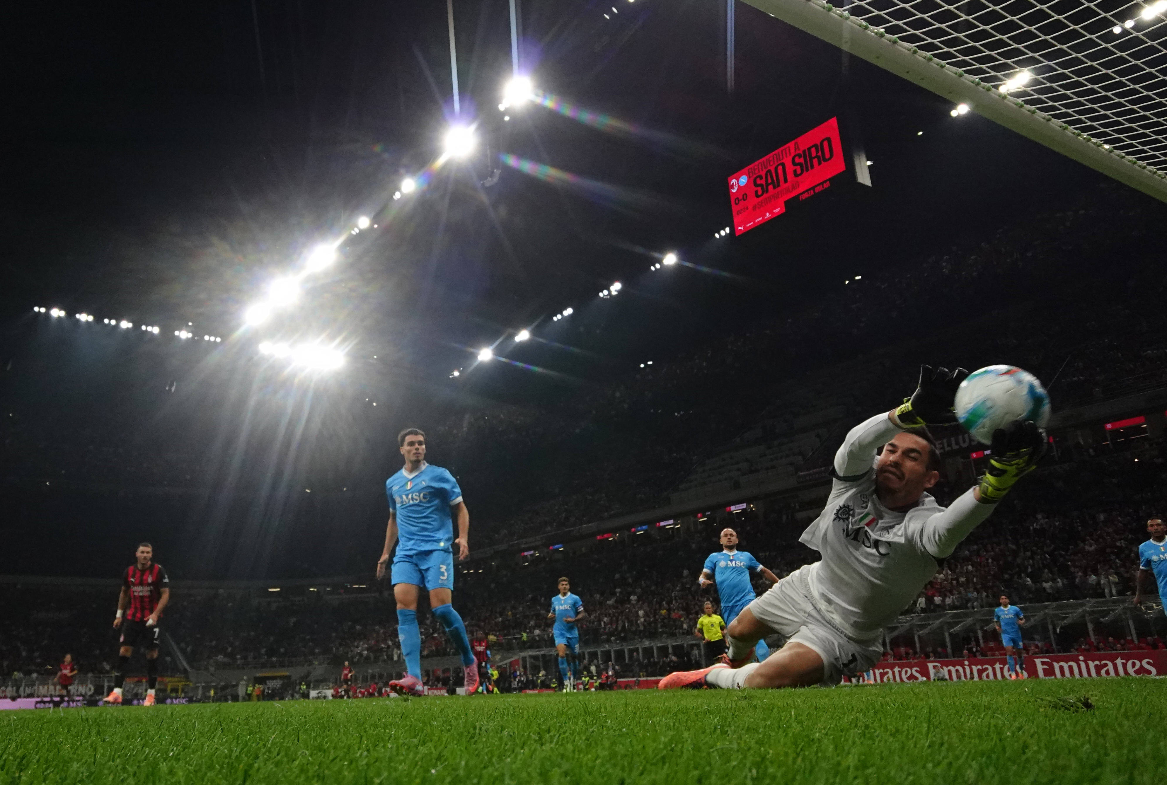 9月28日,那不勒斯队守门员梅雷特未能扑出AC米兰队球员萨勒马克尔斯的射门。 新华社发(阿尔贝托·林格利亚摄)