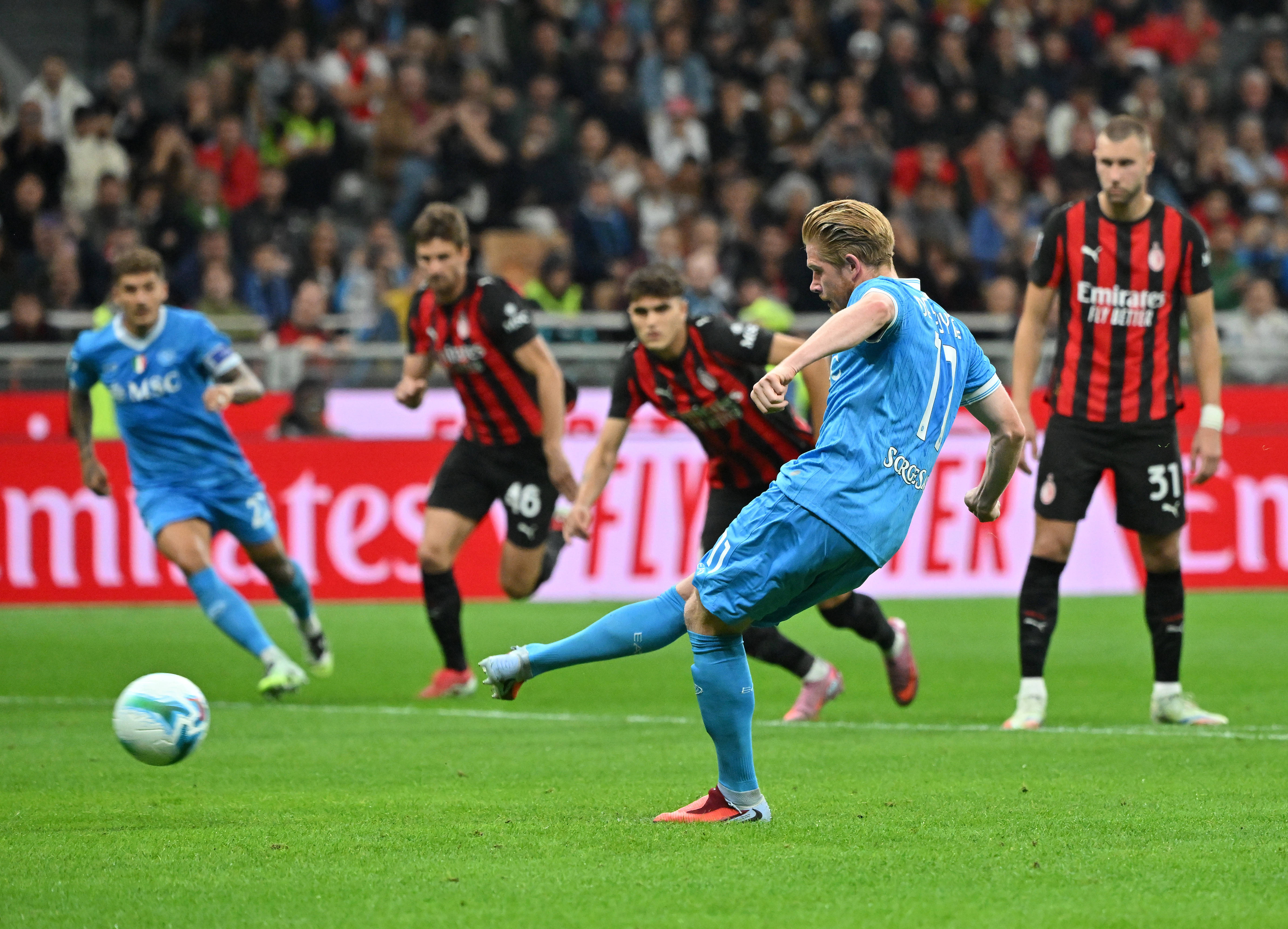 9月28日,那不勒斯队球员德布劳内在比赛中主罚点球命中。 新华社发(阿尔贝托·林格利亚摄)