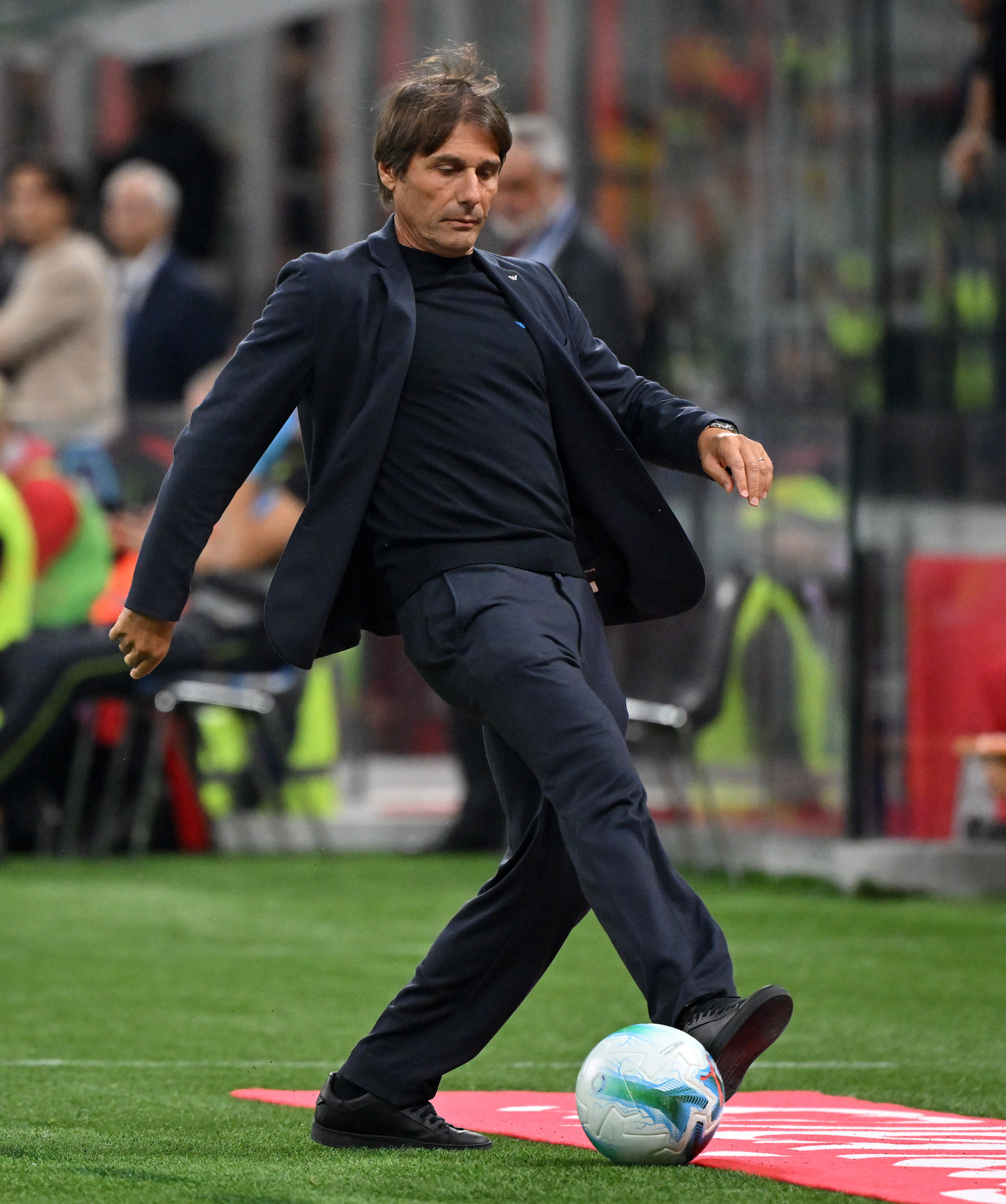 9月28日,那不勒斯队主教练孔蒂在场边控球。 新华社发(阿尔贝托·林格利亚摄)