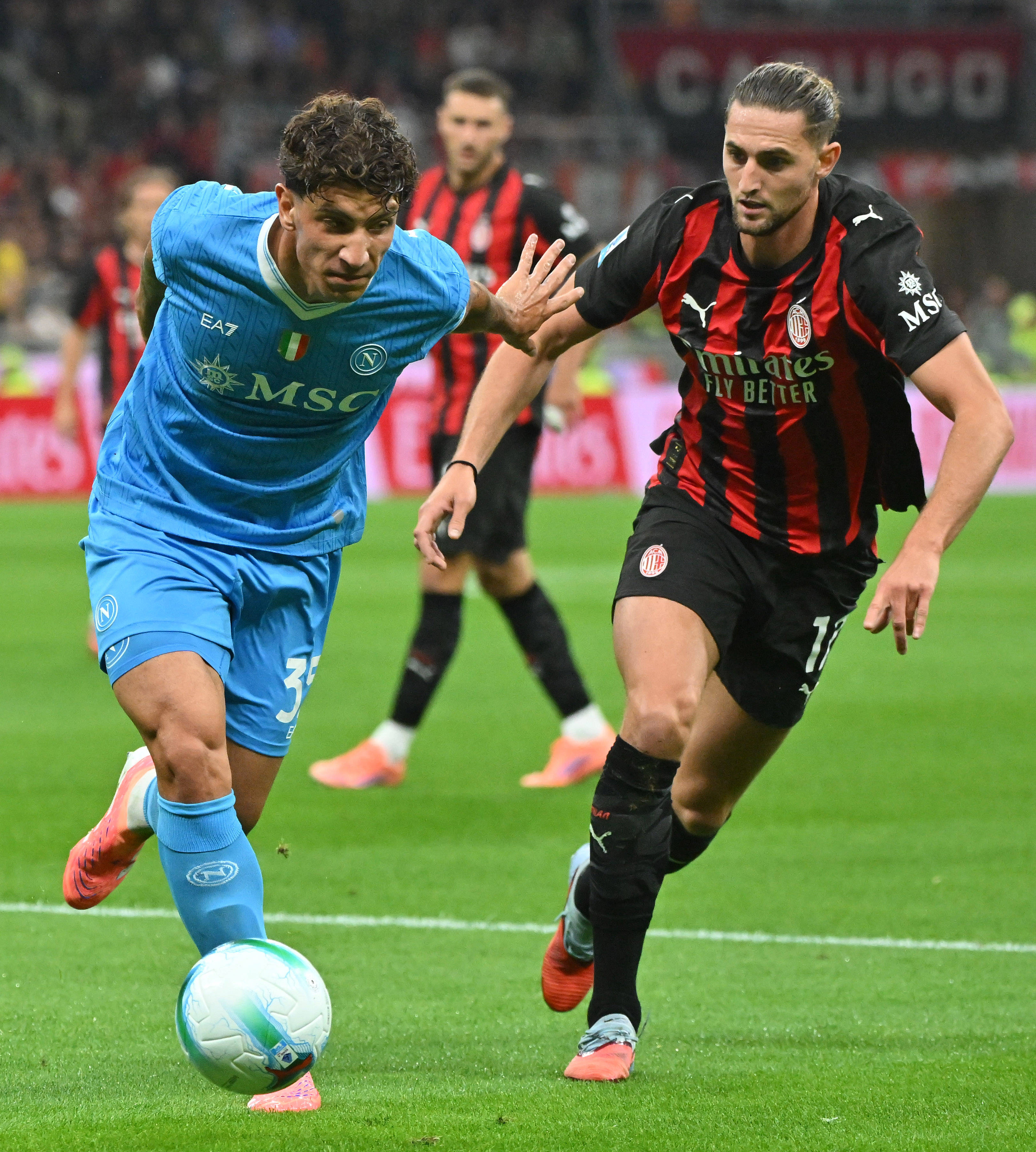9月28日,AC米兰队球员埃斯图皮尼安(左)与那不勒斯队球员波利塔诺在比赛中拼抢。 新华社发(阿尔贝托·林格利亚摄)