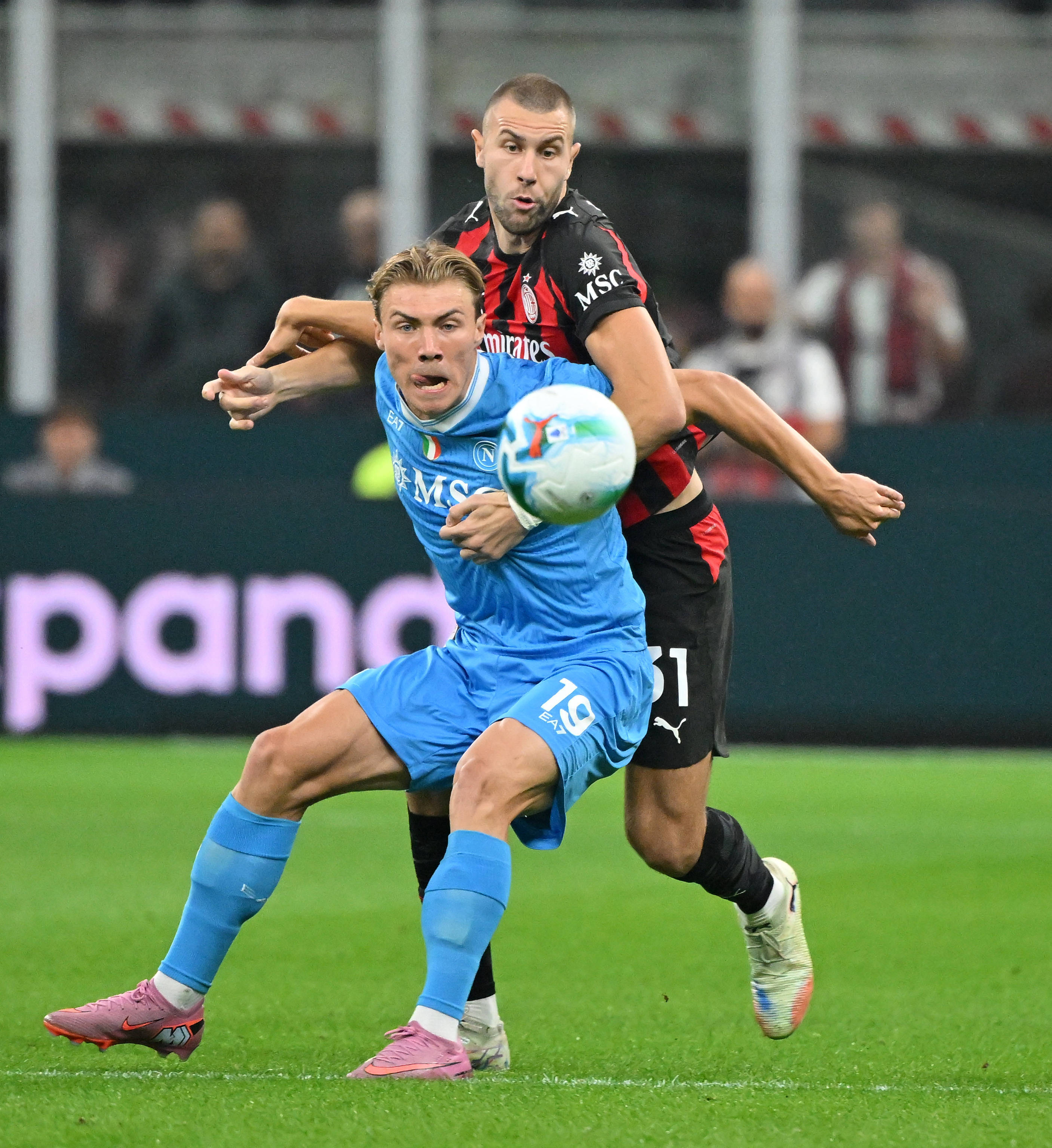 9月28日,AC米兰队球员帕夫洛维奇(右)与那不勒斯队球员霍伊伦在比赛中拼抢。 新华社发(阿尔贝托·林格利亚摄)