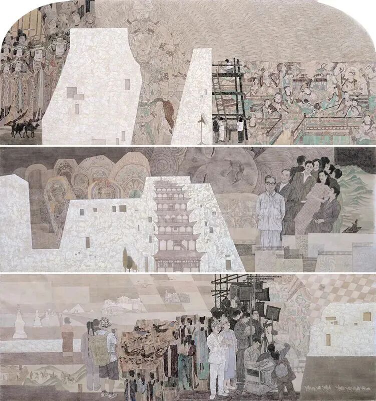 以录洁囡的中国画《乐守——民间手艺人》为例,画家以微观视角发掘出民间制陶、制笔等手艺人平凡的日常劳作场面,并通过工笔重彩画的方式、淡雅的色调、丰富的视觉层次将他们的默默坚守推至大众面前。苏丽霞的壁画《敦煌的守护者们》将视角重点转向对“守护者”的观照,由对“物”的保护转向对“守护人”的推崇与致敬。靳瑞强的中国画《妙乐荡万载》的立意则基于传为唐代画家吴道子的白描长卷《八十七神仙卷》。通过主体为黑白灰的构图方式,将传统白描与现代构成同构,强化了画面的形式意趣和视觉冲击力。