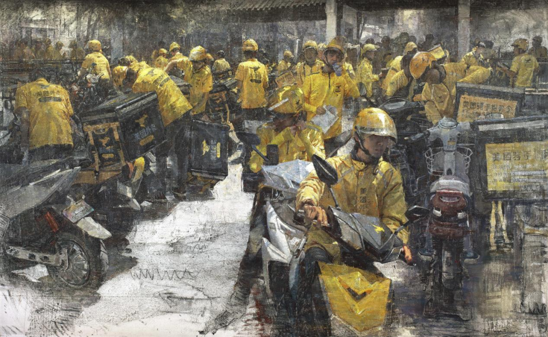 在城市化进程加速推进的当下,外卖骑手、环卫工人、快递员等活跃在城市毛细血管中的新劳动群体,正逐渐成为新时代劳动题材美术创作中极具时代特征的描绘对象。此次展览中,刘亚安的《时代新景·都市蜜蜂》便以街头巷尾的外卖骑手这一群体在配送站点集结时的瞬间场景为创作灵感来源。画面中,众多身着统一黄色工装、头戴安全盔的骑手,围绕在电动车与外卖箱旁忙碌而有序地工作。他们或低头核验订单信息,或俯身整理保温餐箱,或跨坐车辆整装待发,犹如现代都市中的蜜蜂,辛勤劳作、坚韧而默默无闻。他们穿梭于楼宇巷陌之间,步履不停、使命必达,生动诠释了新时代中国青年的精神风貌。画面中没有对话的呈现,也没有明确的叙事线索,而是完全依靠密集的人群、重复的动作与紧凑的视觉构图来传递一种强烈的节奏感与紧迫感。这种无声的表现方式,恰恰凸显了该群体在都市语境下高频率、高强度的工作特质。创作者以娴熟的构图技巧与冷暖对比的色彩运用,成功塑造了外卖骑手这一新时代城市劳动者形象,也很好地凸显出文艺传达时代心声,艺术家致敬平凡中的伟大、为人民放歌这一使命担当的主题。