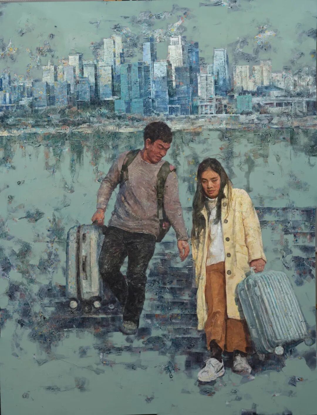观看者伫立在张杰的油画组画《城市梦》前,首先感受到的是油画颜料堆砌而形成的一种厚重感。这种厚重感犹如一股势不可挡的洪流,直抵观看者的内心深处,使人不由自主地联想到城市化进程中那些奔赴城市、追逐梦想的打拼群体的艰辛与执着。从整体造型来看,两幅作品皆以重庆这座“山城”的变迁作为创作背景,画面没有刻意渲染宏大叙事,而是以通俗易懂、接地气的平民视角和人文精神来观照城市务工群体的生存状态,通过斑驳的笔触与富有质感的色调,呈现新时代背景下人们对城市生活的憧憬以及为梦想而拼搏的身影。第一幅作品的中远景呈现高楼与旧街区并存的景象,前景是背着沉重行囊的一家人,年轻母亲背着婴儿、牵着孩童,父亲拎着行李。这家人的背影投射出一种艰辛与无奈交织的情绪。第二幅作品的中远景同样是密集的现代建筑群,前景是拖着行李箱的一对年轻打工者,步伐虽显疲惫却坚定,暗含着对未来的期许。两幅作品中人物“负重前行”的姿态与行李的沉重形态,共同指向“城市迁徙”这一核心主题。很明显,创作者通过对务工、求学等人口流动社会现实的深度思考和艺术表达,使作品超越了简单的图像再现,升华为对时代变迁中个体命运的深切观照。