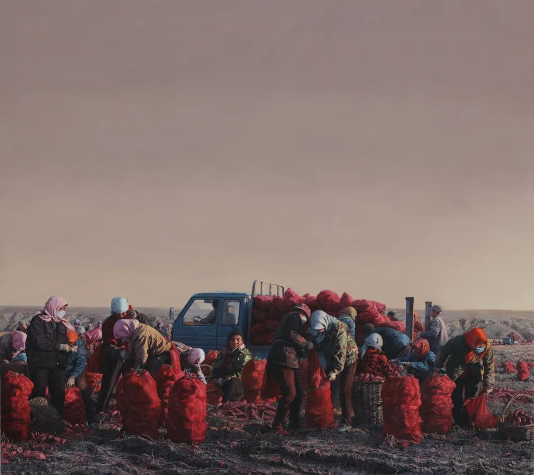 在当代美术创作领域中,如何精准捕捉并呈现劳动场景中的平凡之美,始终是众多美术创作者们不断探索的方向。在此次展览中,我们不难发现,有多位艺术家的作品成功地表达了劳动场景中的独特诗意与美感,崔先进的油画《朝阳》即其中典型的例证。从整幅作品的光影与色彩氛围来看,暖黄色调笼罩整个画面,空旷的天空与土地的颜色交融渗透,构筑出一种庄重且饱含希望的晨曦微露图景。与此同时,近景处错落的红色编织袋,在暖黄基调的映衬下显得格外醒目,为画面注入了强烈的视觉冲击力与情感张力。从画面的细节刻画来看,画家运用超写实表现手法,将普通人田间劳作的场景刻画得精微而隽永。例如,画中人物头戴围巾、身着朴素衣物,弯腰装袋的姿态自然真切;散落田间的红薯与车上堆叠的编织袋也被刻画得生动入微。这些看似寻常且微小的瞬间和物象,经由画家的艺术处理,被赋予了别样的诗意美感与艺术感染力。从某种意义上来说,正是这种对平凡劳动瞬间的诗意表达,才是对生活最真实的记录与礼赞。