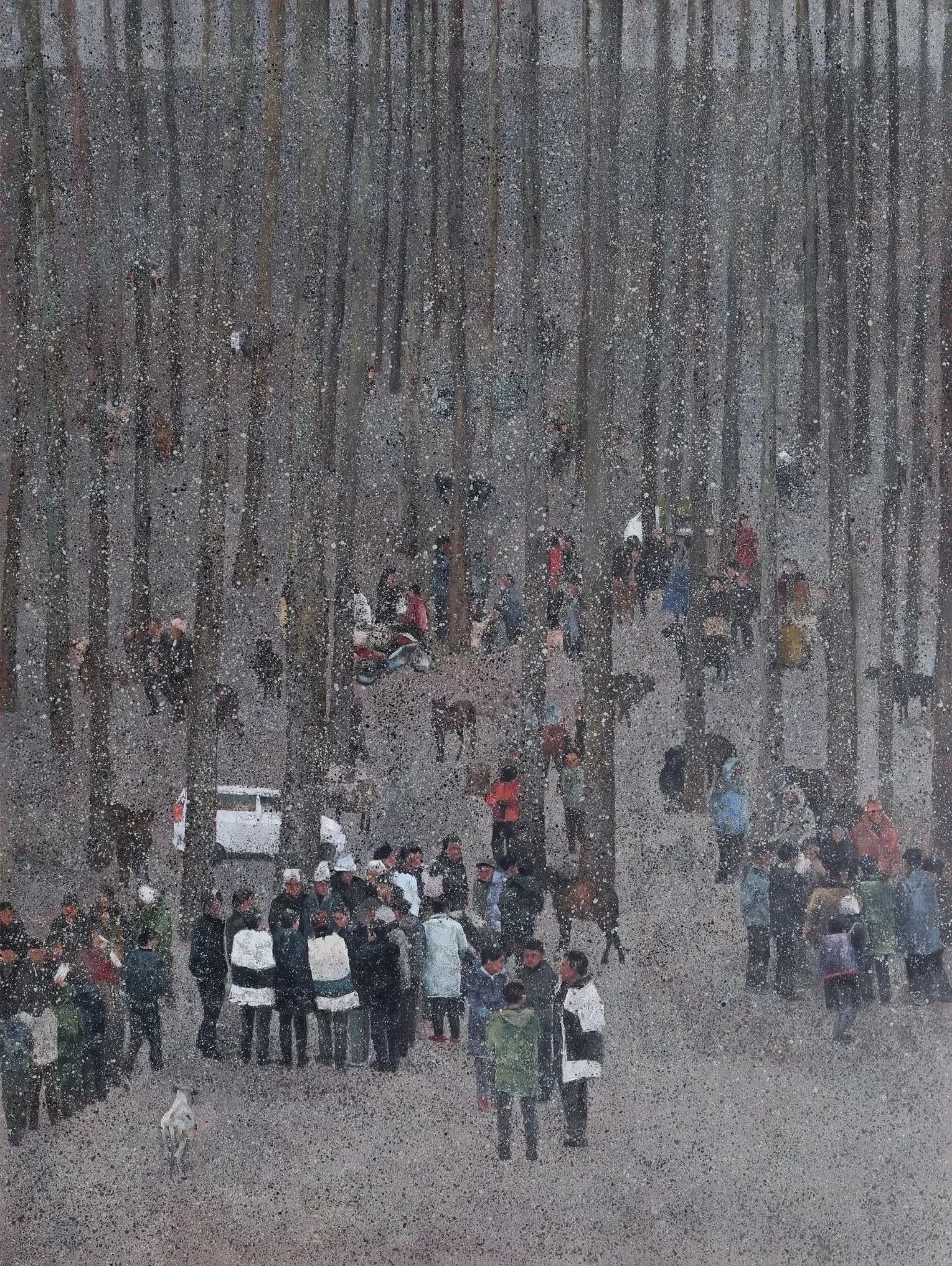 廖林在他的油画作品《牛牛坝之记忆》中描绘了人群聚集、车辆与牲畜共存的景象,既带有自然的质朴又因人群活动而充满生活气息,这些元素共同勾勒出一段关于社会生活、人际互动的片段,将观者带回过去的某个岁月。从作品中,我们得以感受到那段历史的温度,也得以见证城市与乡村交融、传统与现代元素更迭的时代背景下生活场景的独特风貌。