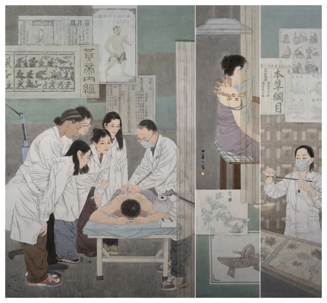 在画家王勇的作品《中华大医》中,画面左侧一位身着白大褂的中医正在床边为患者进行针灸,另一边聚拢着几位年轻的学徒,这一画面生动呈现了中医非物质文化遗产的传承。中医传承的关键在于培养新一代的中医人才。这些年轻学子的参与和学习为中医的持续发展注入了新鲜血液,保障了中医在社会建设中能够继续发挥其独特的医疗和文化价值。整幅画面是对坚守中医传承的新老一代劳动者的歌颂。