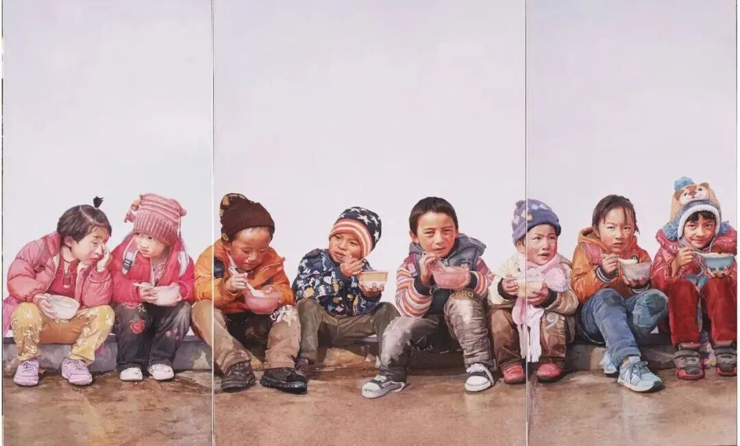 在“共绘新时代”展览中,还有部分艺术家通过独特的艺术表达,将不同类型的个体在当前社会发展中所遭遇的困境展现了出来,或是留守儿童、残障人士等社会弱势群体,或是来到大城市打拼追梦的“打工人”又或是面临择业困惑的“知识青年”等。这些艺术作品努力为这一群体发声,表达他们的处境和诉求,希望被社会“看见”,进而实现更深层次的社会参与。在画家李慧的作品《阳光午餐》中,孩子们的形象栩栩如生,他们穿着并不华丽,甚至有些朴素,戴着样式简单的帽子,脸上流露着略显懵懂的神情。这些细节刻画,让观者能够联想到留守儿童、孤儿院儿童等边缘群体。他们在物质条件和情感关怀上面临的匮乏引发了人们对他们生活状态的关切与同情。这类作品以艺术的形式呼吁社会给予他们更多的关爱、教育资源和生活支持,助力他们拥有更好的未来。