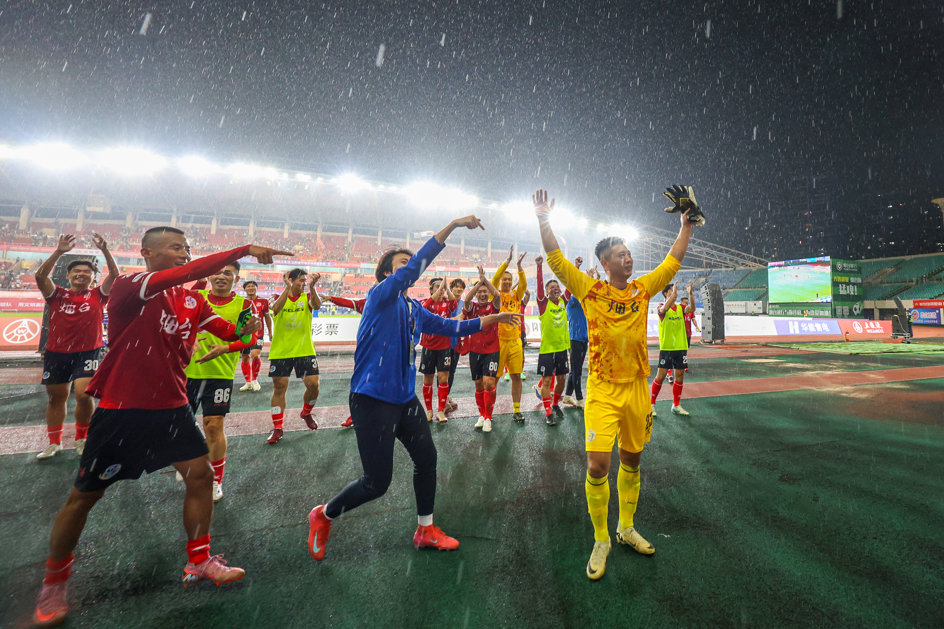 烟台对战潍坊的比赛结束后,王海和烟台队队员到看台旁感谢球迷