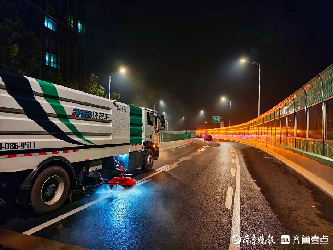 双节期间,济南城管严格落实“洒、冲、洗、吸、扫”多样式“三机五步”联合作业,确保道路达到“六净一洁见本色”要求。