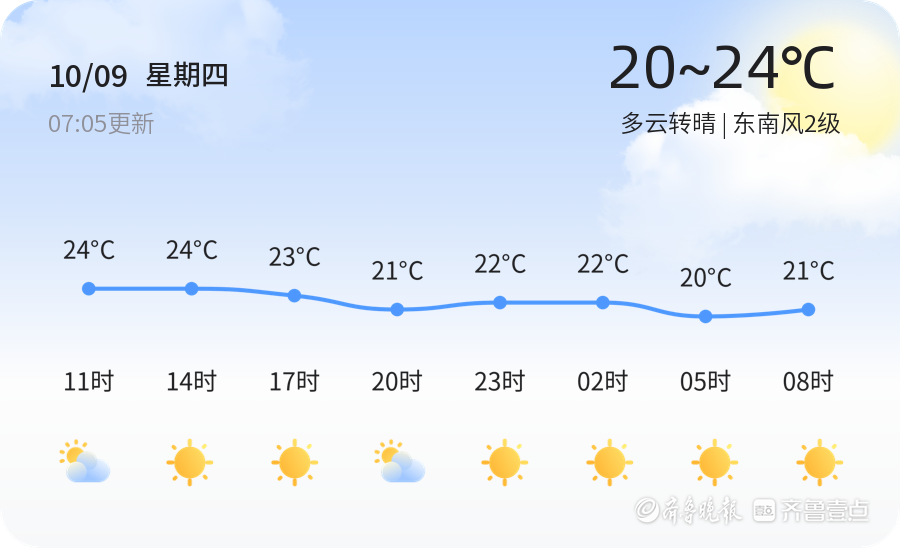 今天是10月9日,星期四,农历八月十八。日照市今日天气多云转晴,气温介于20℃至24℃之间,东南风2级,空气湿度81%,PM2.5指数为30,空气质量良好。各区天气情况总体平稳,均为多云转晴,市民朋友们可以享受一个晴朗的秋日。