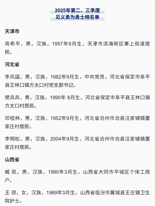 2025年10月9日,中央政法委在京发布2025年第二、三季度见义勇为勇士榜。根据网络关注度和各地各单位依规确认、推荐进行综合评审,共有69位见义勇为勇士光荣上榜。